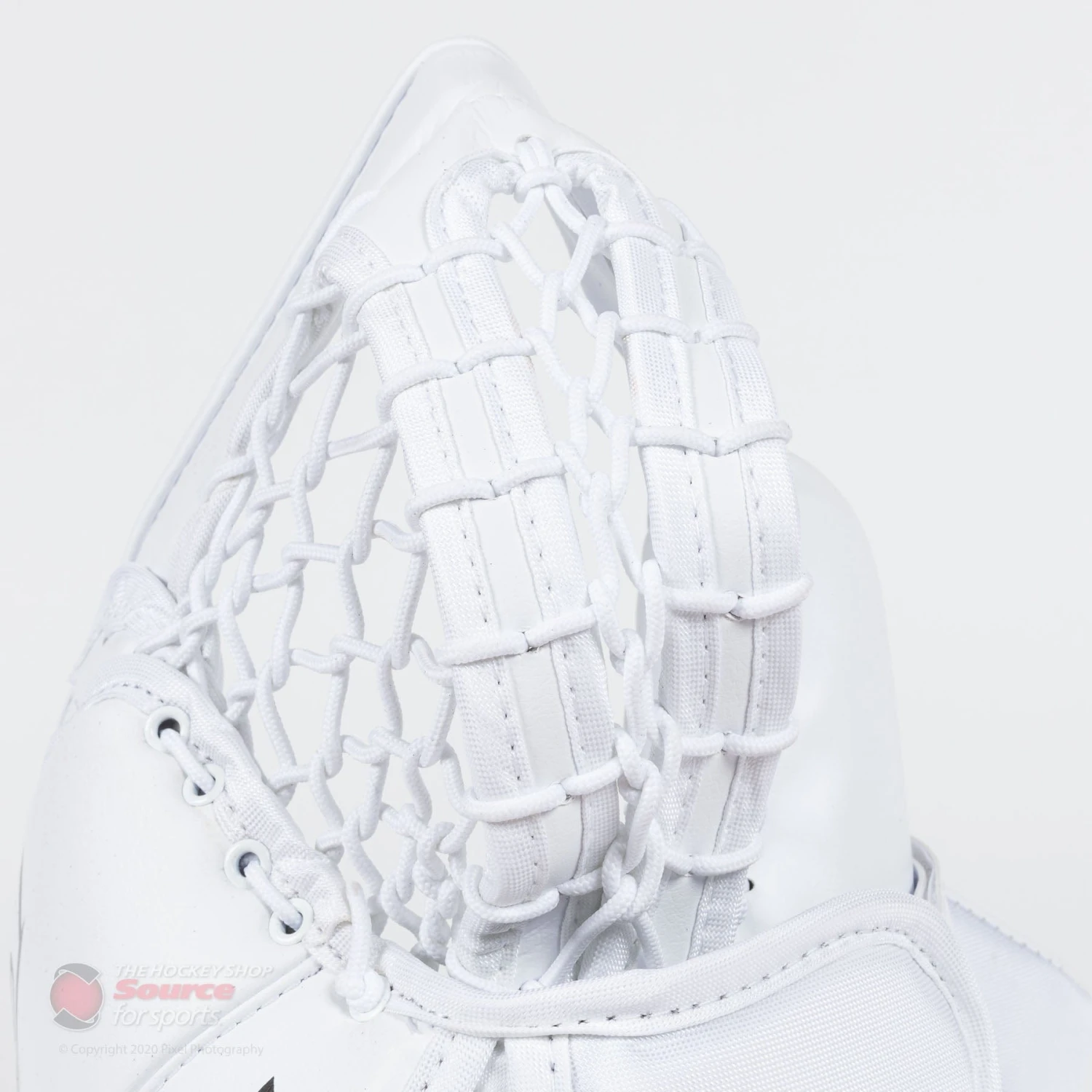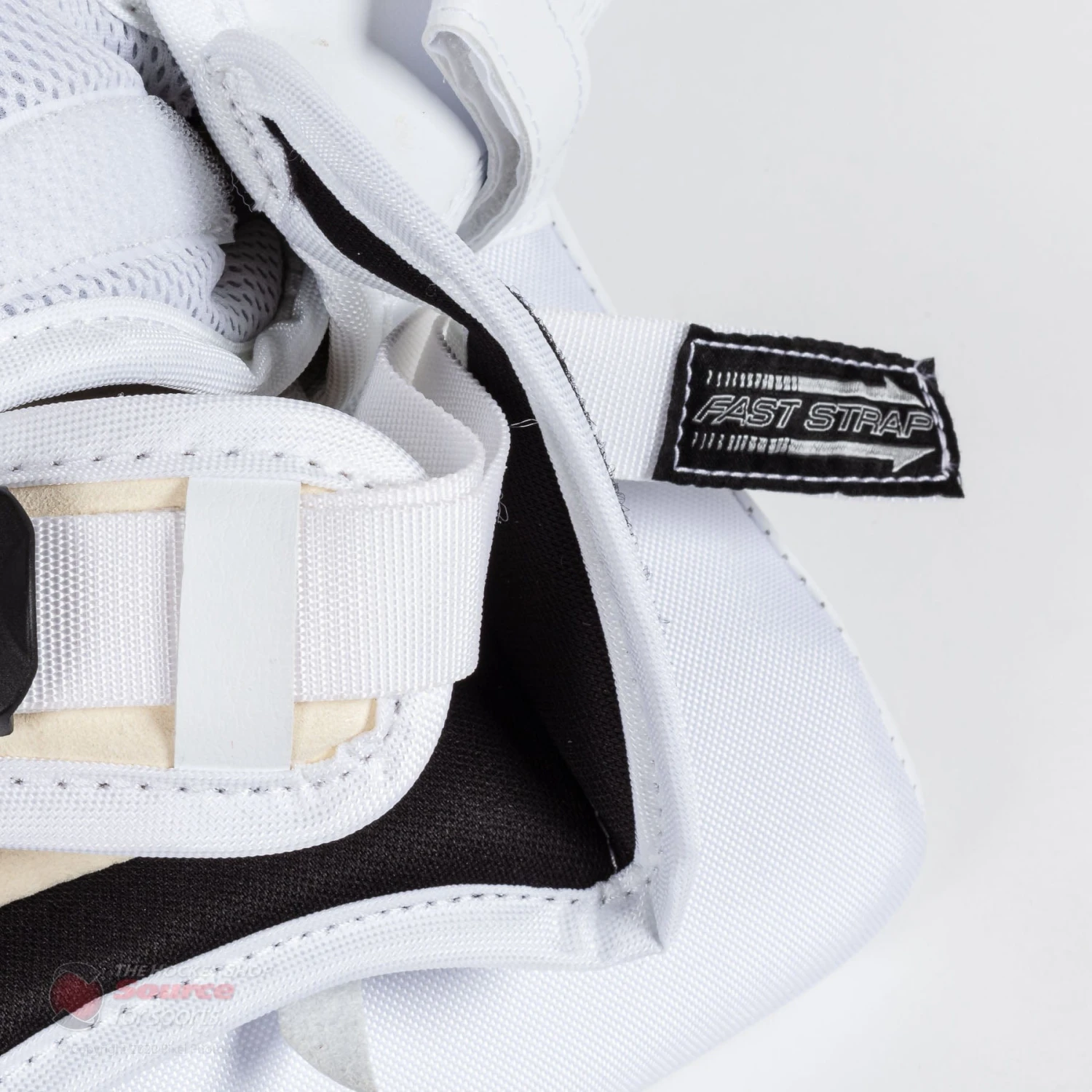 The Bauer GSX INT trapper is available in White, Black, Navy, and Red. The GSX Goalie Glove is available in Regular hand (worn on your left hand) in all colourways, and Full Right (worn on your right hand) in All White.