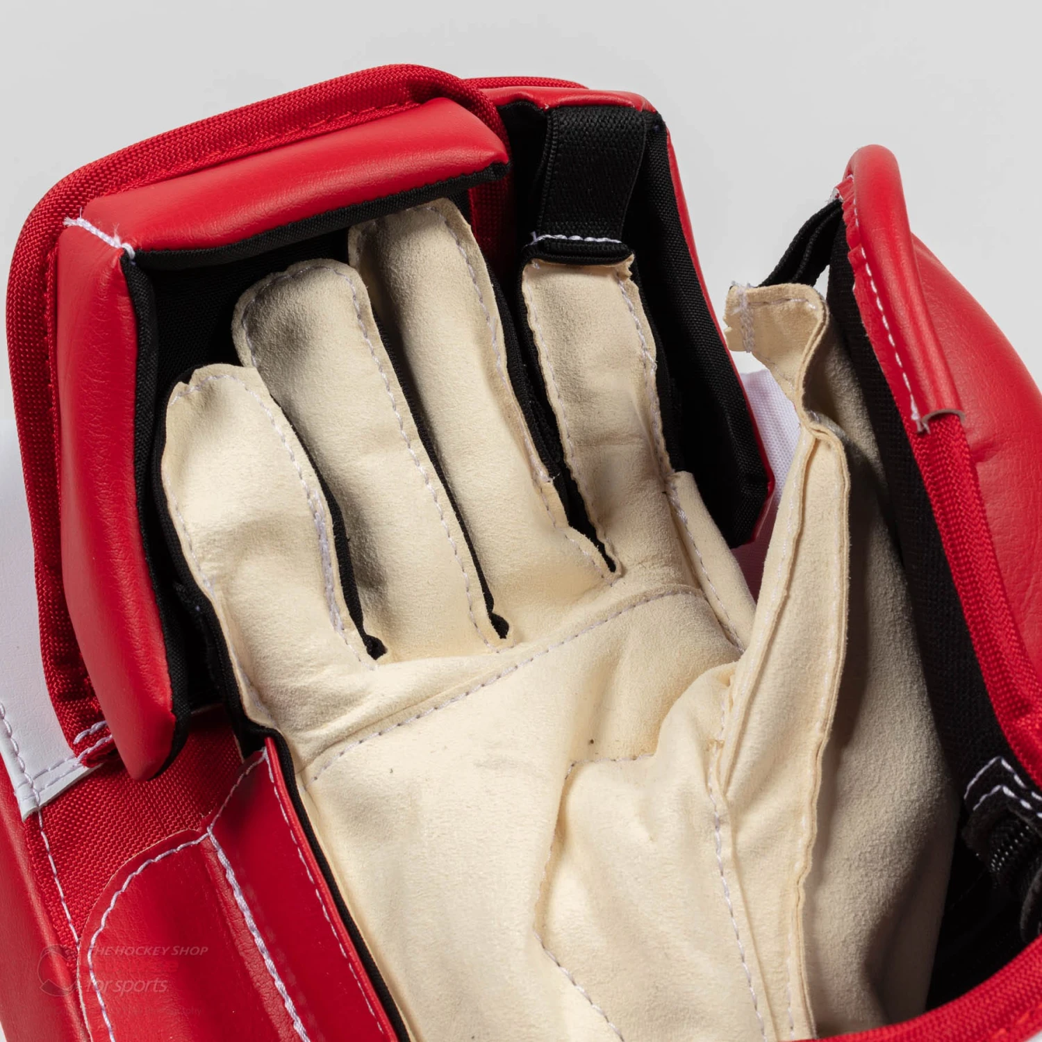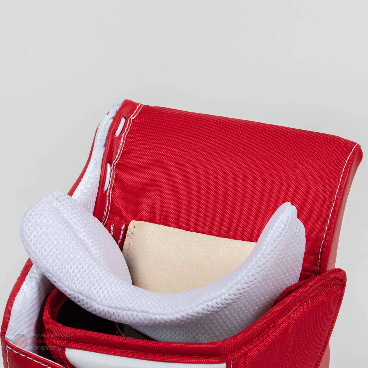 The Bauer GSX SR blocker is available in all White, Black, Navy, and Red. The GSX Goalie Blocker is available in Regular hand (worn on your right hand) in all colourways, and Full Right (worn on your left hand) in All White.