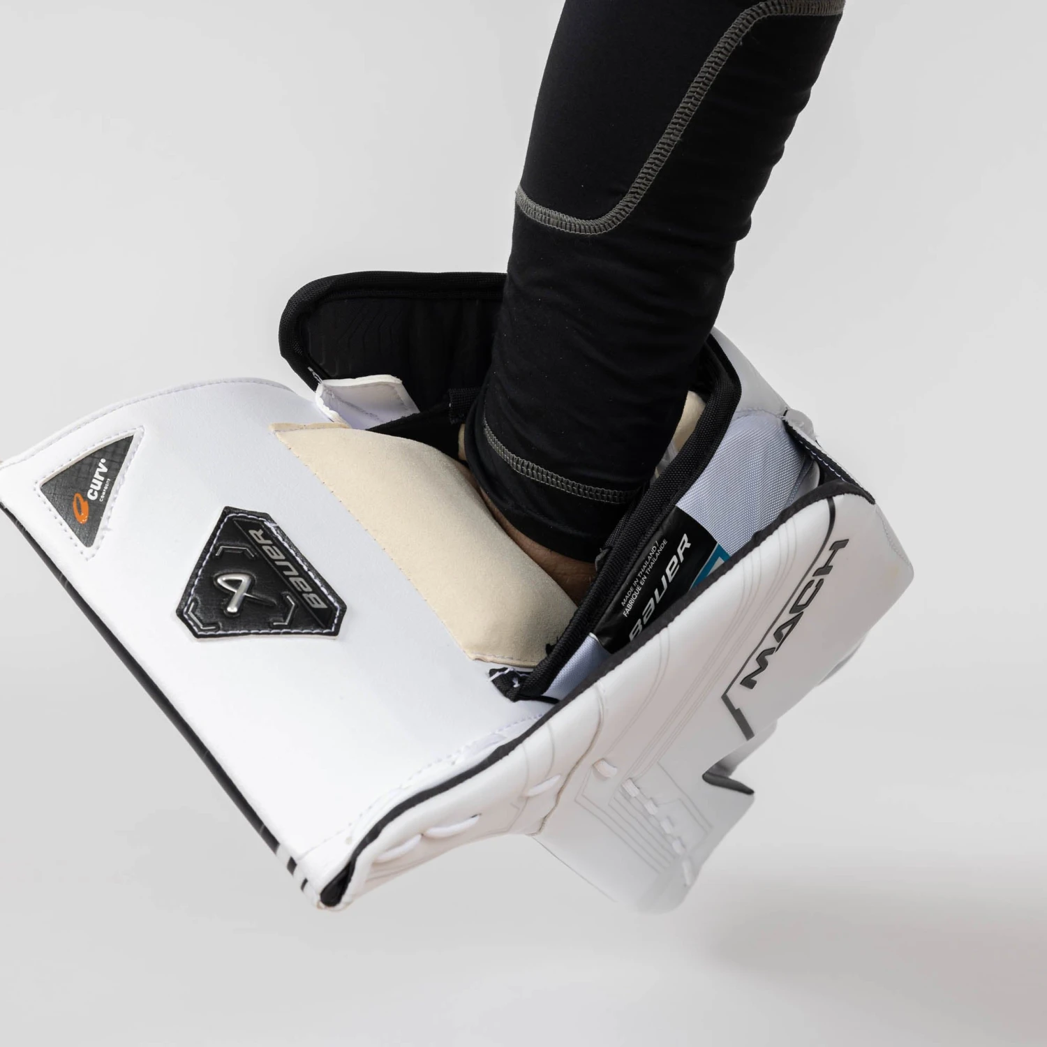 Bauer took to demonstrating their goalie expertise with the new Supreme Mach goalie blocker. Featuring a Connekt+ liner and palm, CURV composite in the board, and a Range of Motion (R.O.M.) cuff, the Mach blocker looks to continue the legacy of the Supreme line by offering elite-level performance to your game.