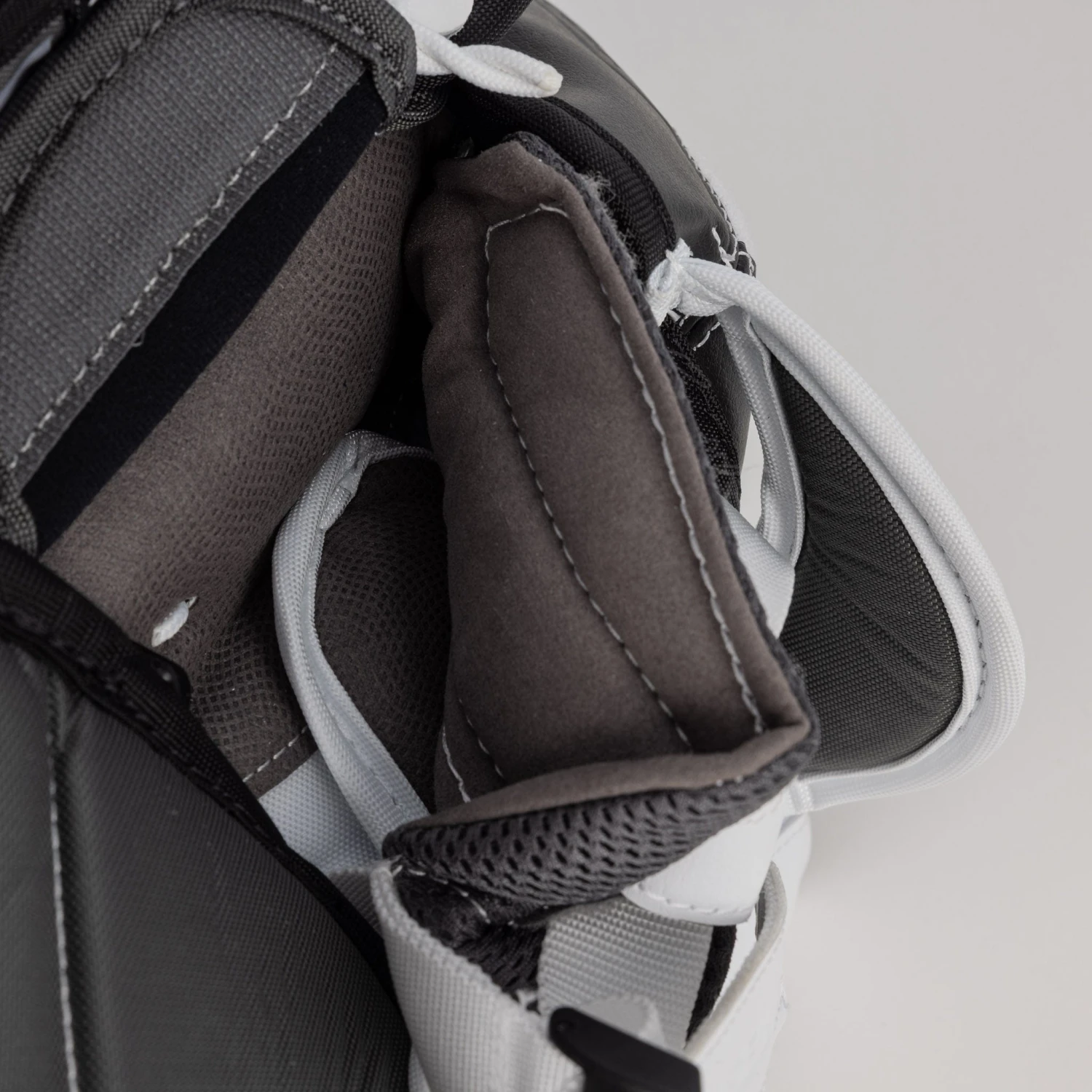 The 60-degree break closure is a deeper, more full-hand closure (fingers to the base of the thumb) that we’ve seen before in the Vapor family. It provides a good balance of coverage and mobility. The downward angle of the palm creates a large catching surface that can help goaltenders make catches on high shots, while also allowing for quick, fluid movements when making saves in tight. The angle of the palm is designed to align with the natural curvature of the hand, which can help to reduce stress and fatigue on the wrist and hand over time.