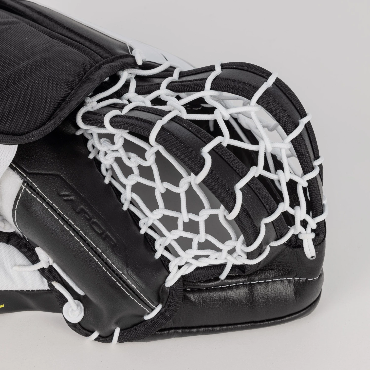 The Vapor X5 uses a double-T pocket design, which provides a large, secure catching surface—the two-piece construction allows the goaltender to trap the puck between the two sections of the pocket, creating a stable grip on the puck. The double-T pocket design allows for quick and easy release of the puck, and it has a natural “funnel” shape that helps guide the puck toward the goaltender’s hand for cleaner and quicker catches.