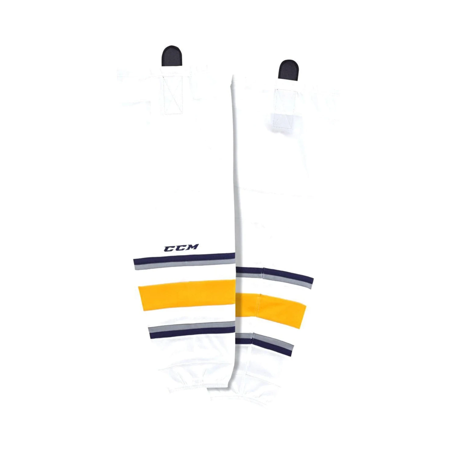 Finally, the socks use two velcro fasteners to keep them in place and feature and embroidered CCM logo on the front. The Quicklite socks are now offered in an expanded size range to fit younger players, and are offered in color schemes from all 32 NHL teams and more!