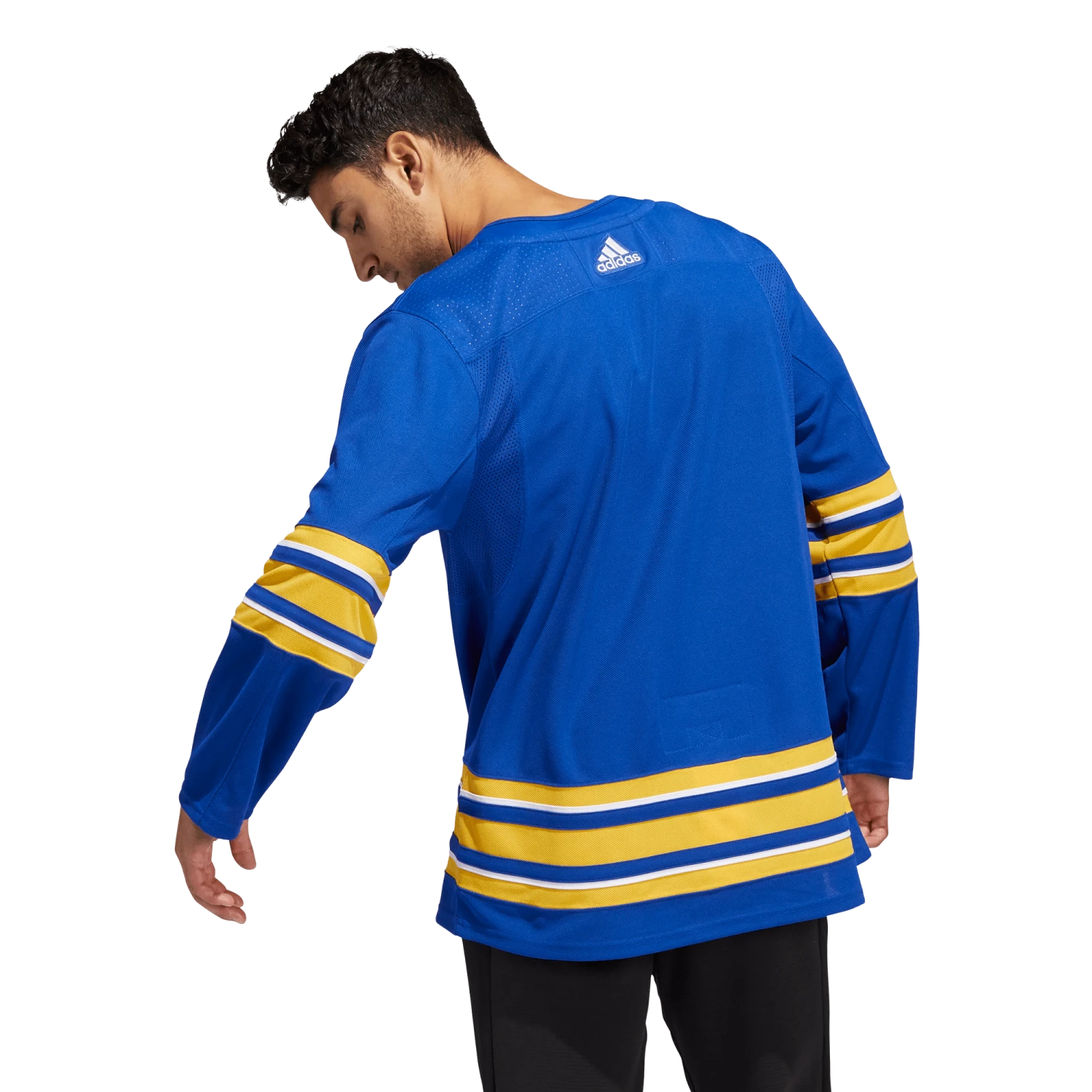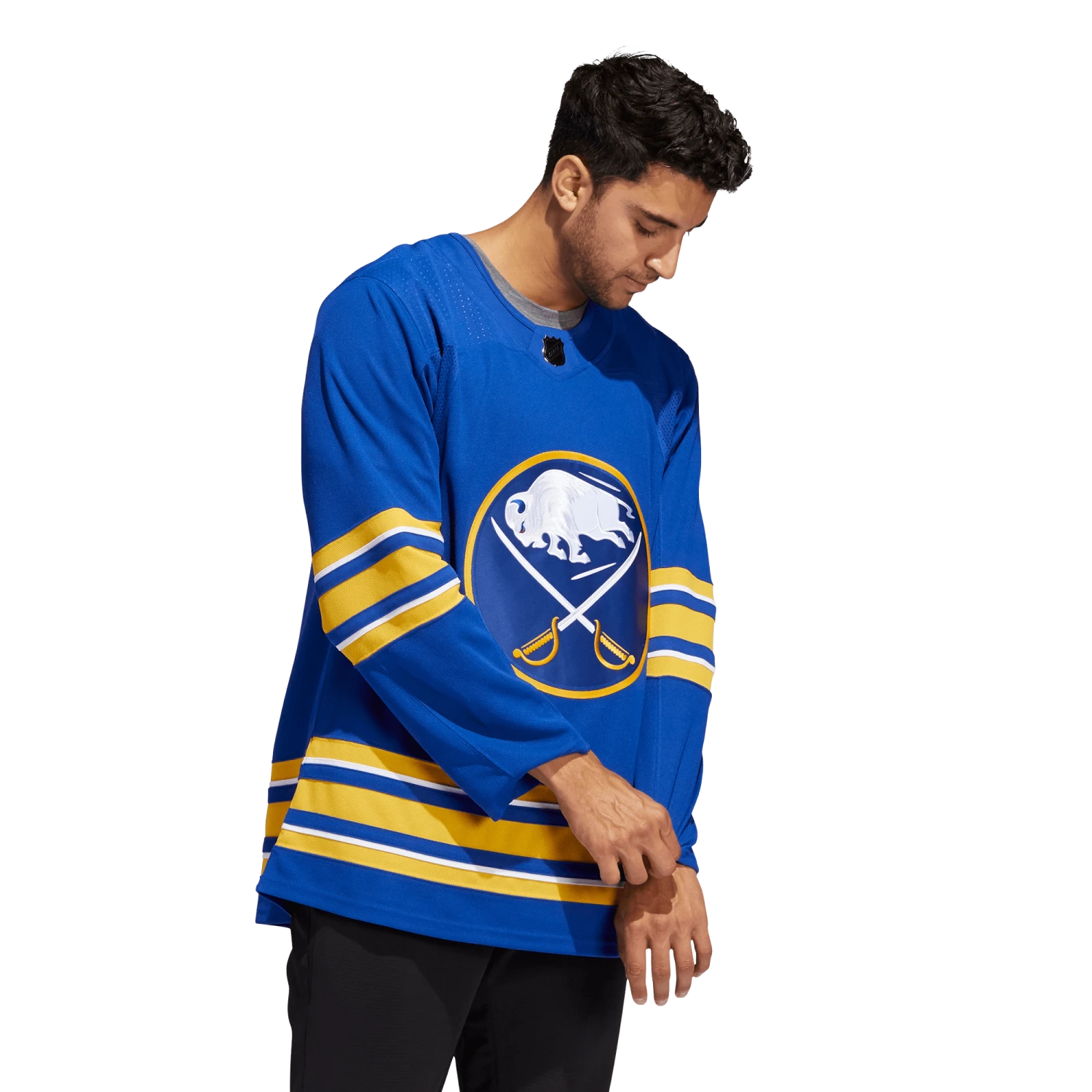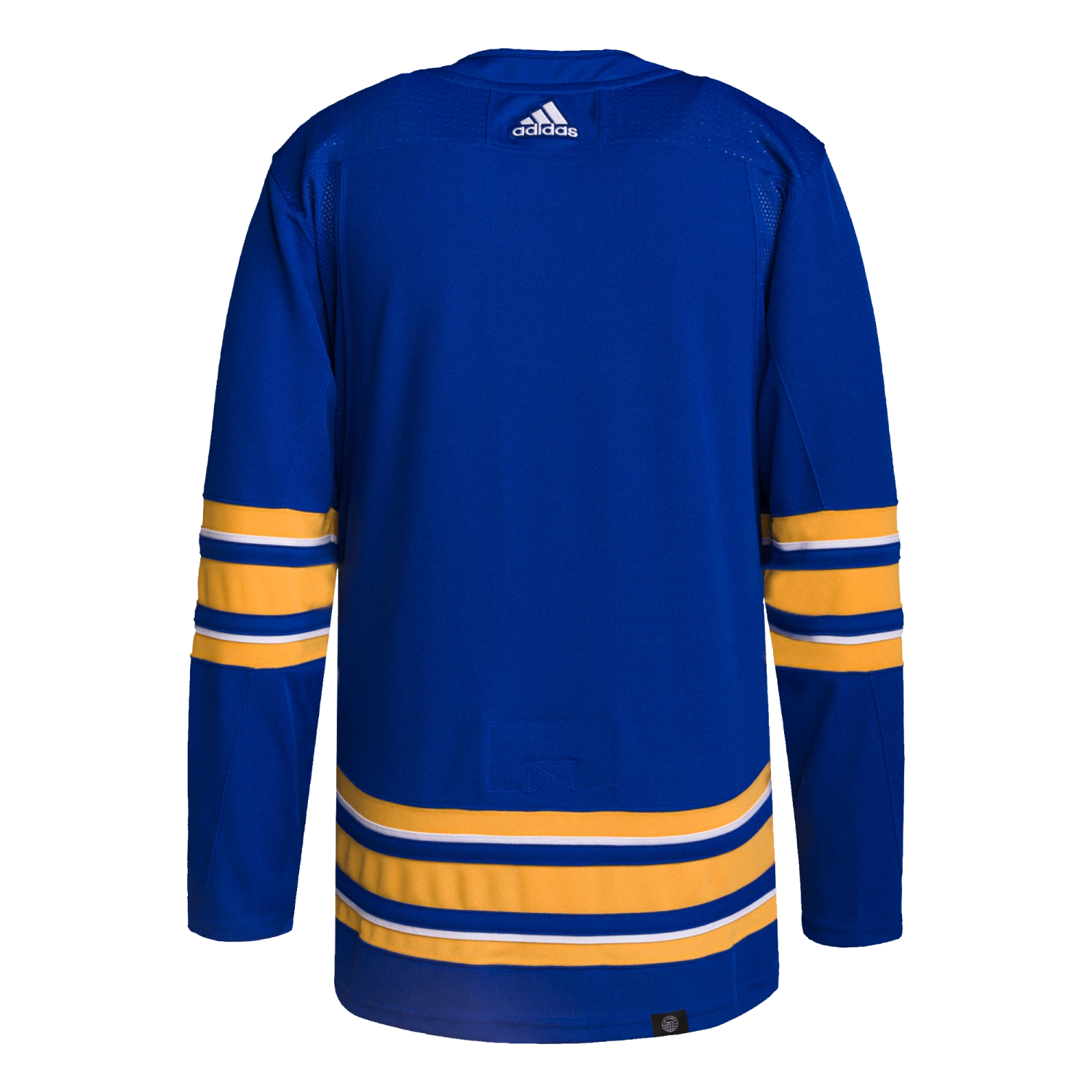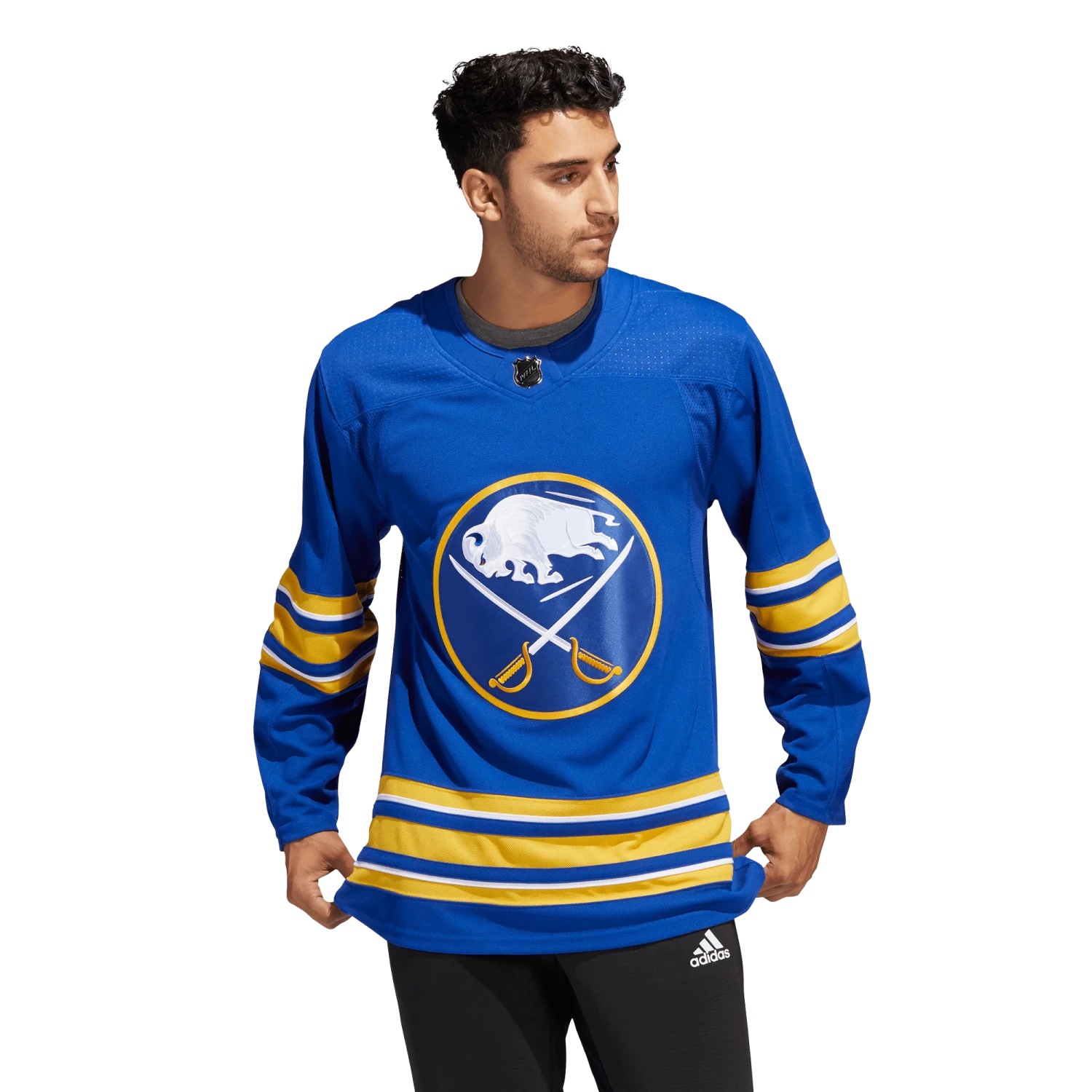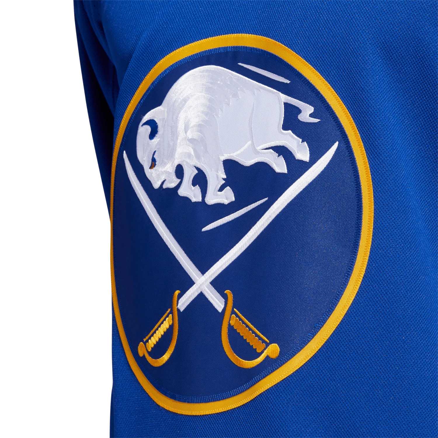 Stroll around the Nickel City with your Buffalo Sabres pride in full view in this adidas authentic home game jersey. AEROREADY keeps you cool and dry as you pick up supplies for tonight’s tailgate party. A mesh underarm insert adds extra breathability when the hot sauce on the wings kicks in. This product is made with Primegreen, a series of high-performance recycled materials.