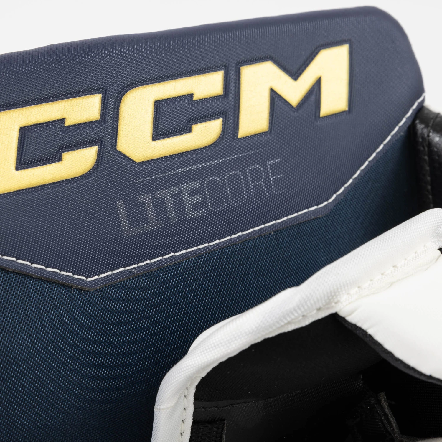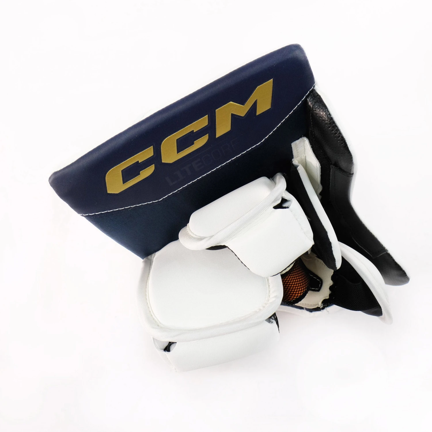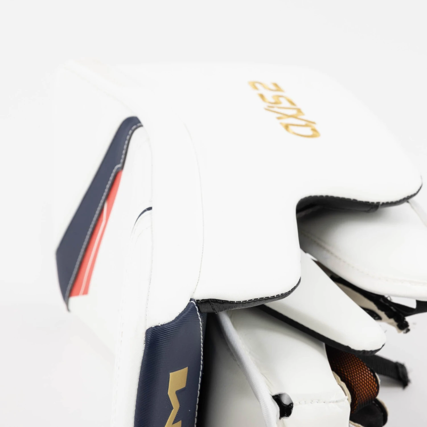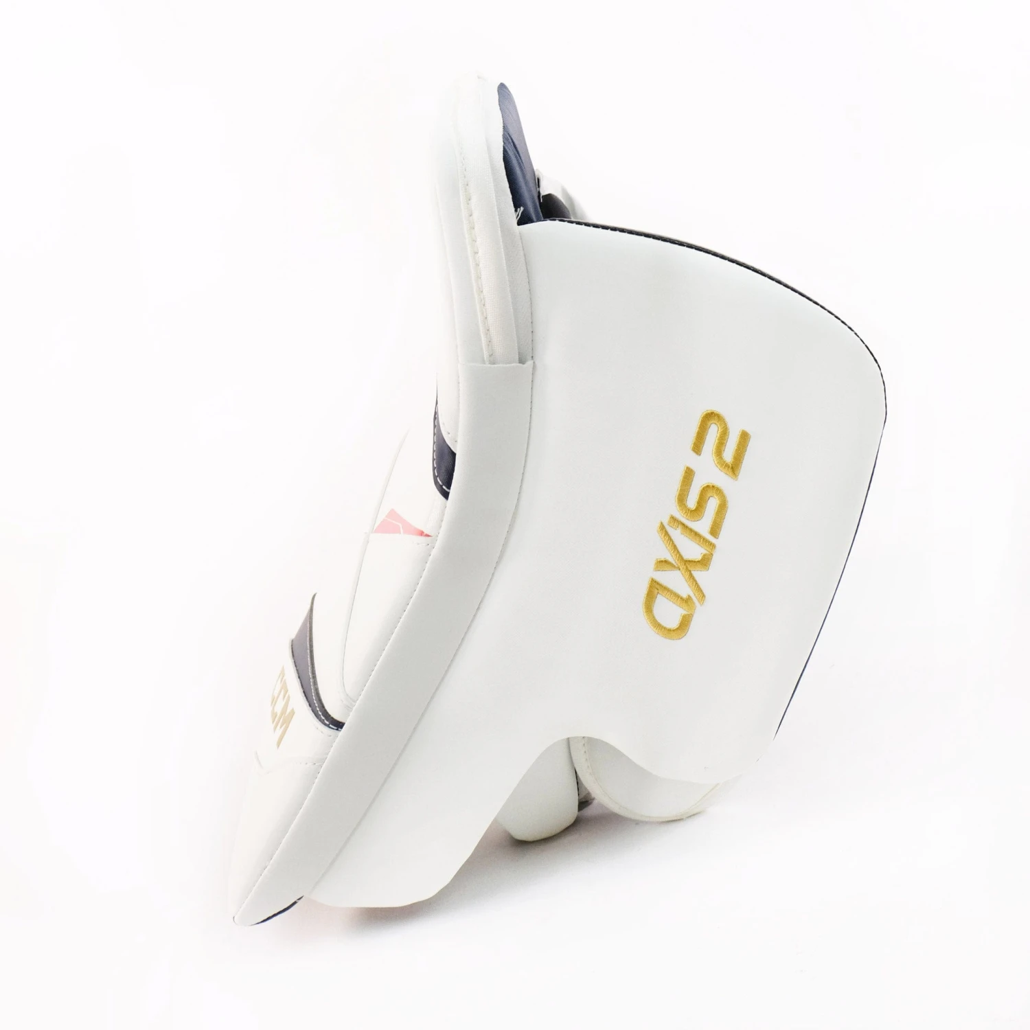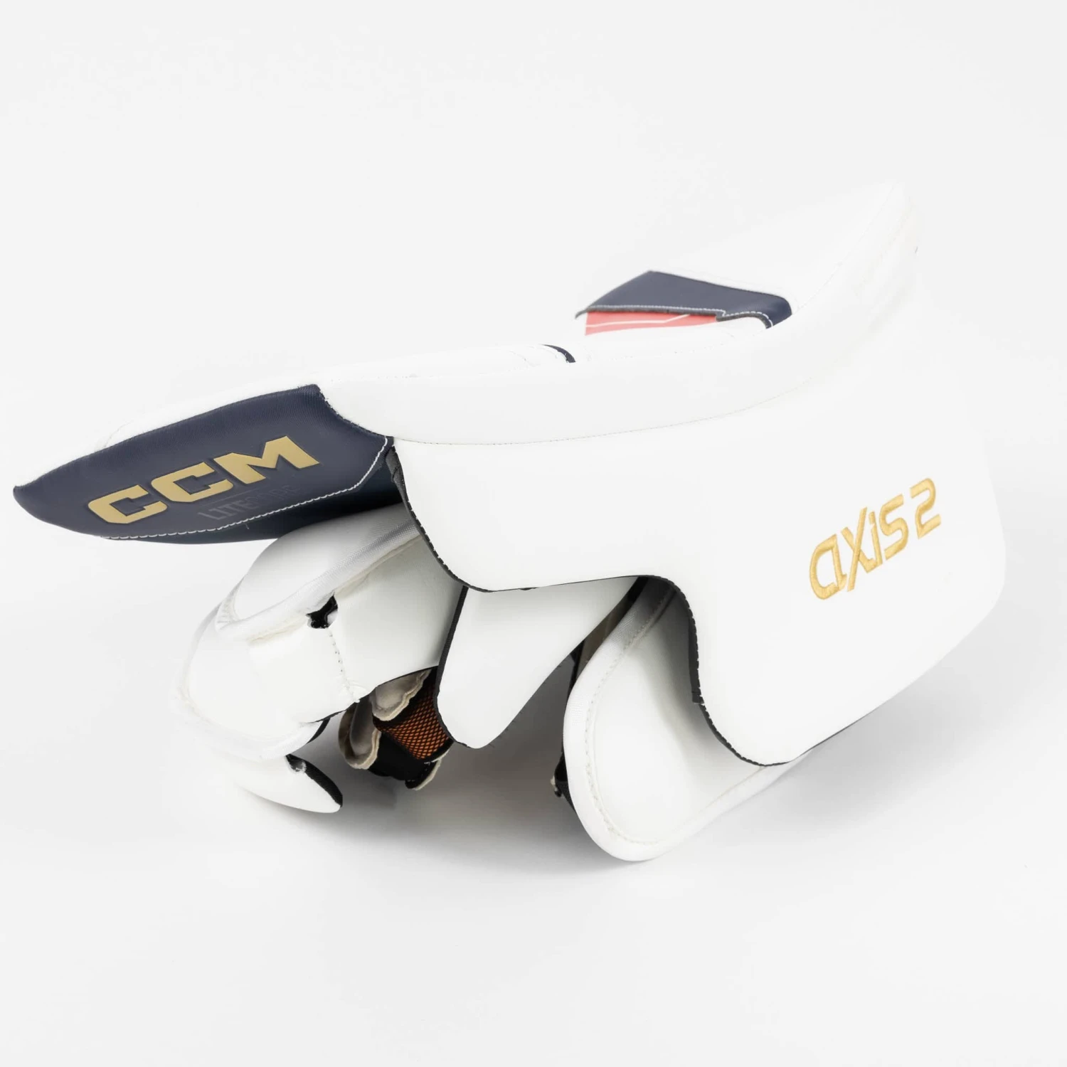 The CCM Axis 2 Senior Goalie Blocker comes in Regular and Full Right configurations, and White and White/Navy/Red/Gold colourways.