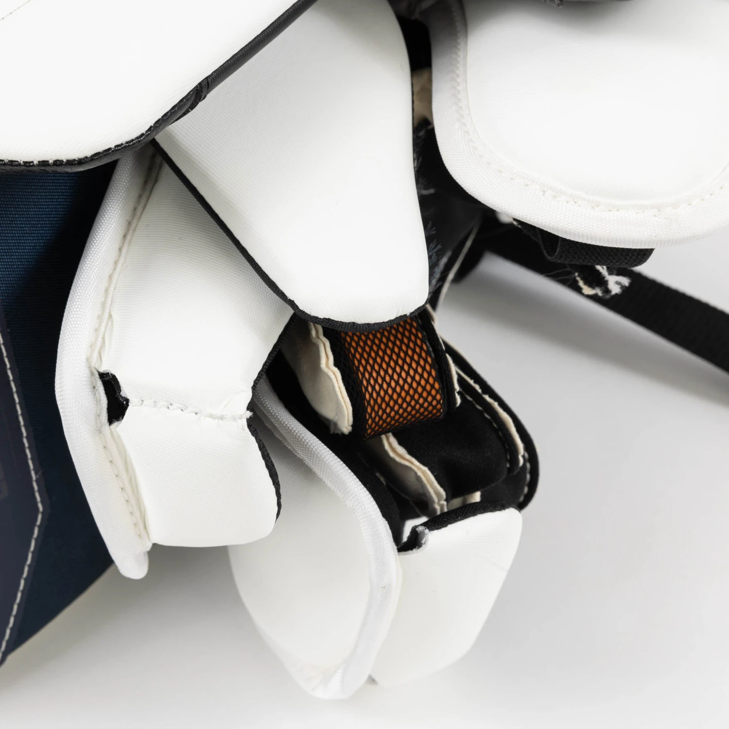 The Axis 2 uses a Flexmotion 2 cuff, which has been segmented strategically to allow for easier movement and a greater range of motion. This is particularly important for butterfly goalies who may need to reach for and direct pucks from odd angles on the ice.