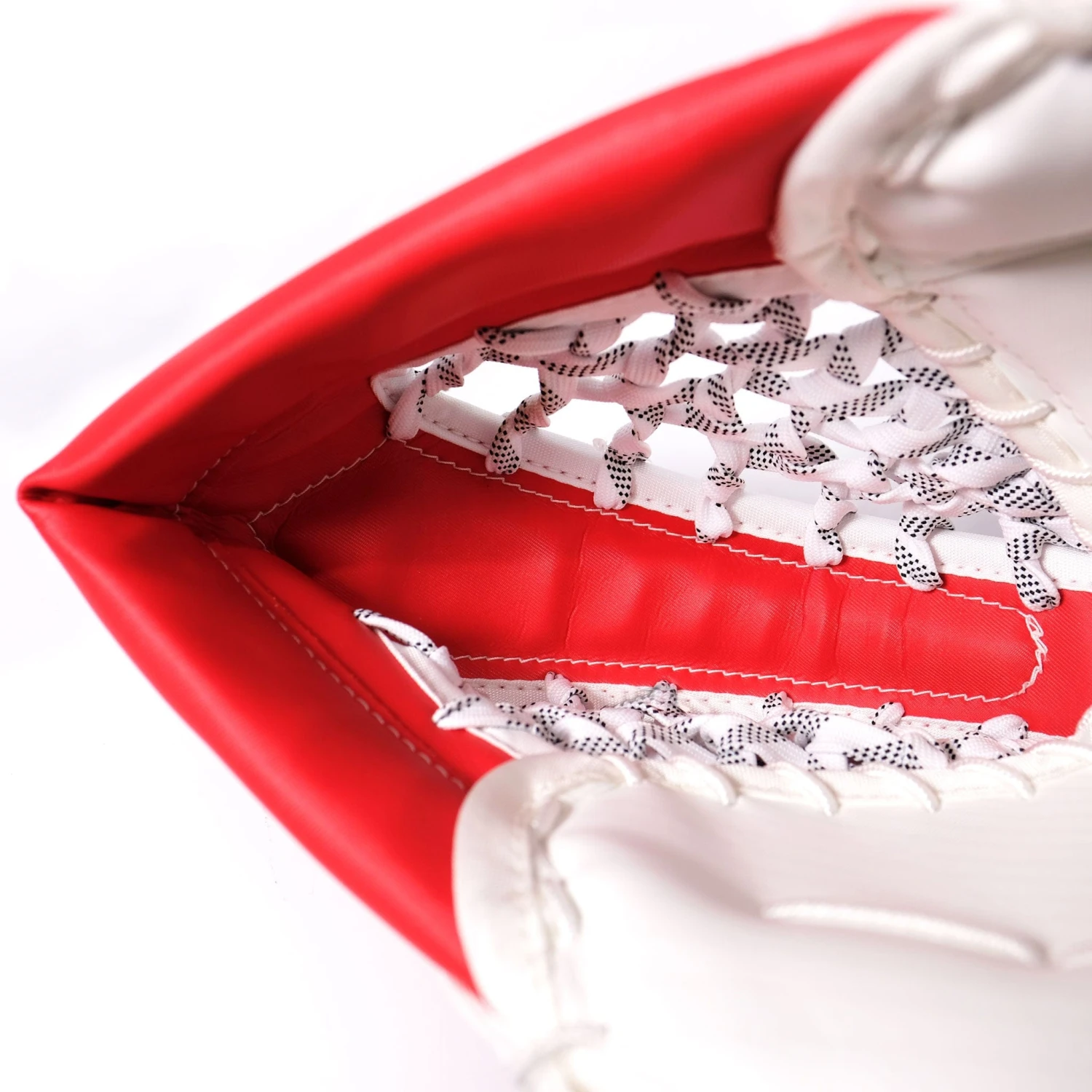 The CCM Axis 2 Senior Goalie Catcher comes in sizes 33+1, 34+1, 34+2, and 35+2, and the following colourways: White, White/Black/Silver, White/Royal/Red, White/Royal, White/Red, White/Black, and Black.