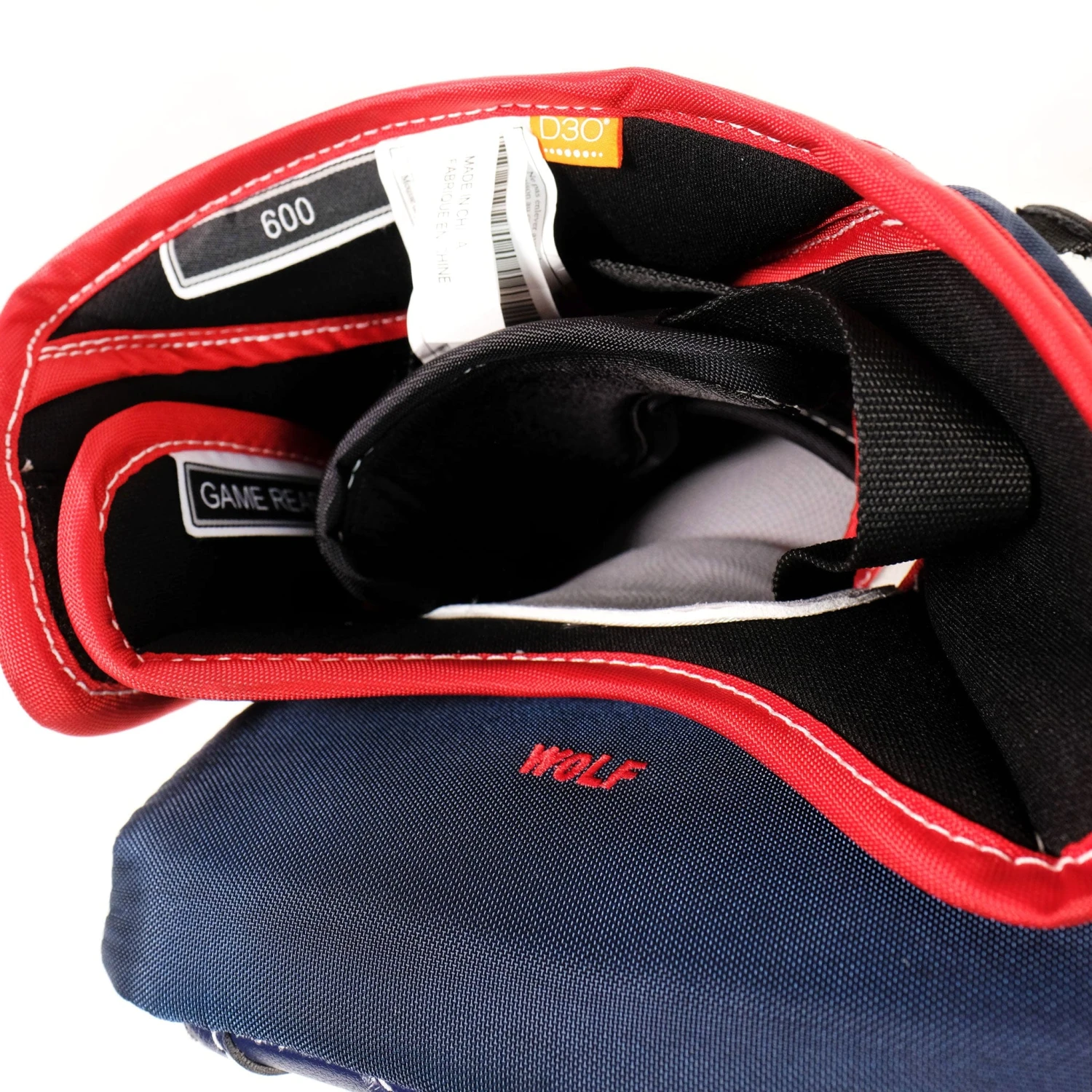 The mainly Jenpro exterior is a popular choice used by many goalies on their gear due to its lightweight feel and durability. The two piece cuff allows for a tighter seal when the goalie brings their catcher close to the body. Rounding out this pro stock glove is the custom red “WOLF” embroidery on the inside of the cuff.Â