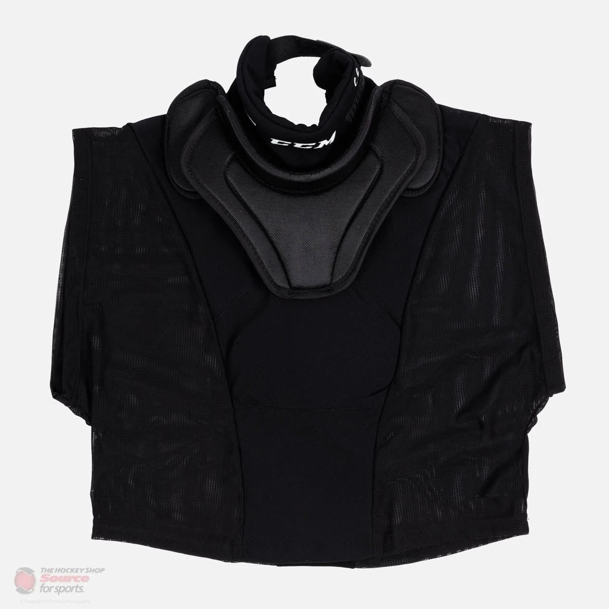 The CCM shirt style throat protector not only gives goaltenders great supplemental sternum and collarbone protection, but also is a fully certified BNQ neck guard. The shirt is made with mesh for breathability as well as ballistic nylon for durability. The neck is directly covered with low-density foam to provide the most comfortable fit, but is reinforced with high-density foams in front of the throat, the collarbone, and the sternum to maximize protection.