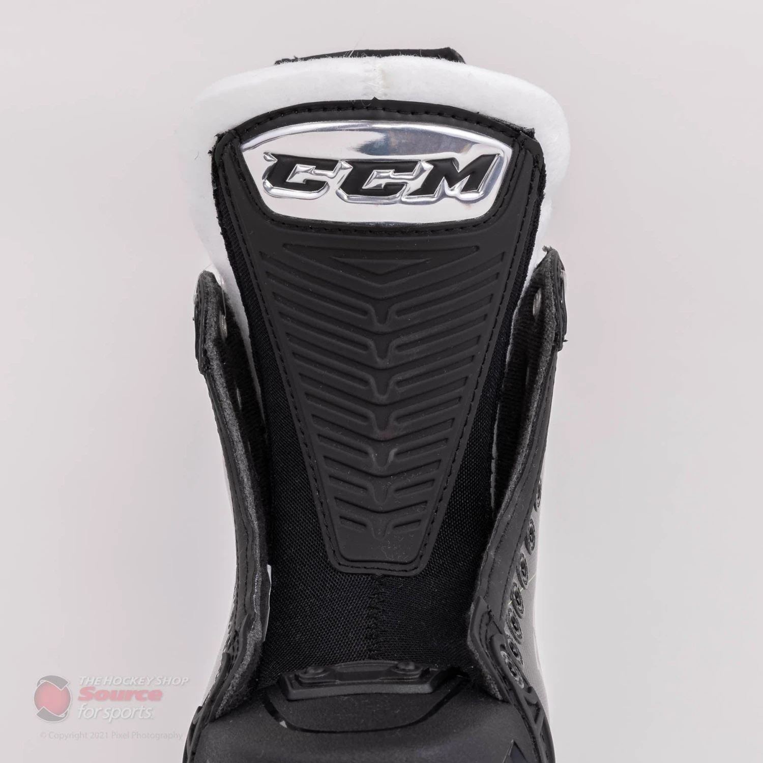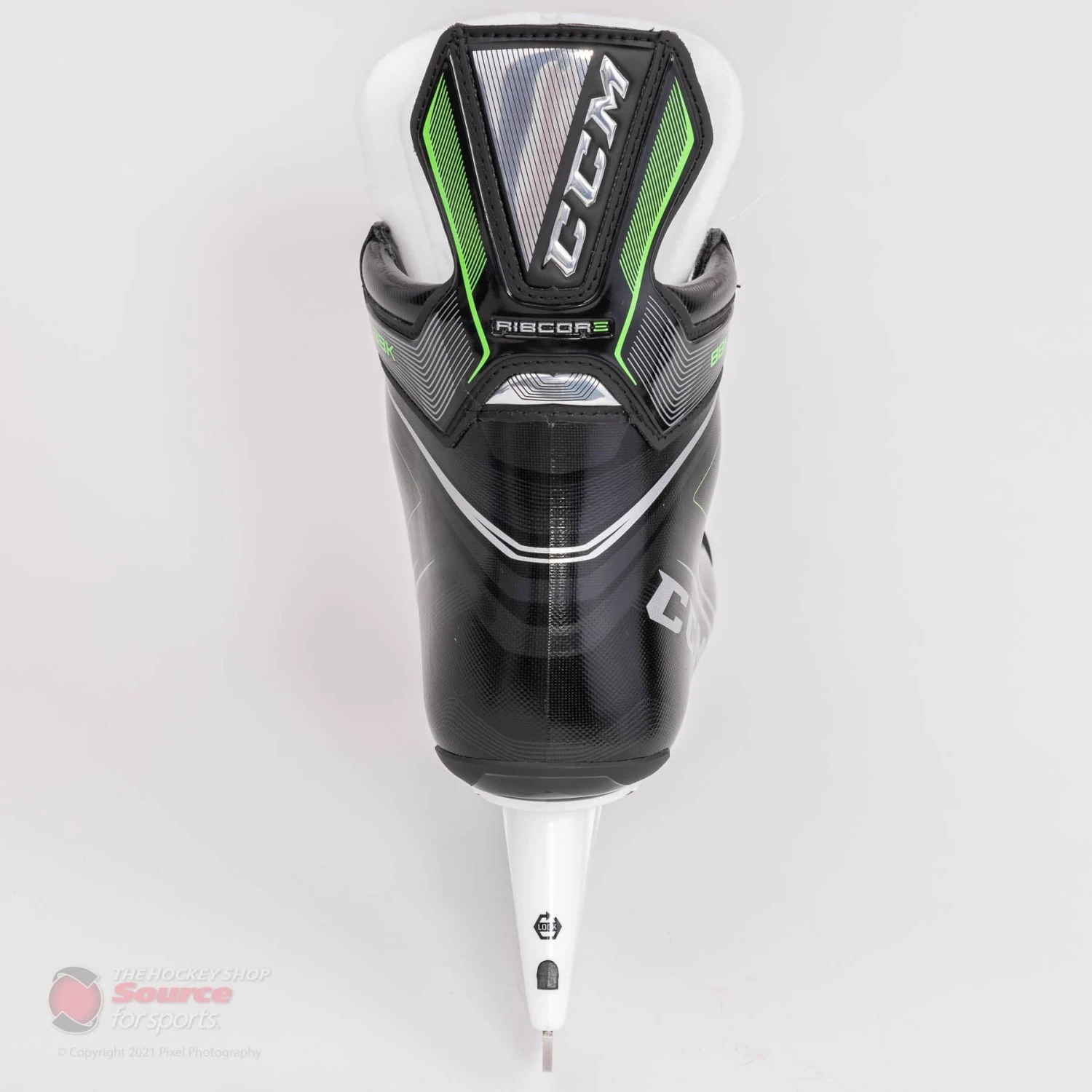 The new graphic for the CCM Ribcore 88K features a glossy silver lined pattern overtop a black finish. CCM finishes the boot off nicely with their classic Ribcore green accents along the tendon guard and base of the heel.