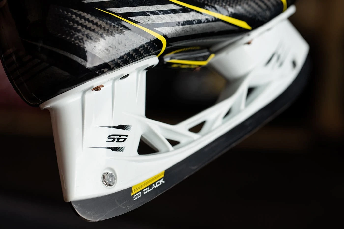 A SpeedBlade holder provides 4mm of extra height from the ice to allow for up to 10% greater turning radius for a more aggressive angle of attack and the SpeedBlade Black steel provides a carbon oxide coating to cut the ice with less friction and provide a longer lasting sharpening as well as advanced performance.