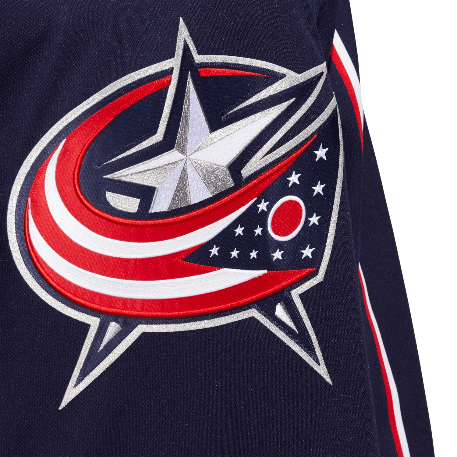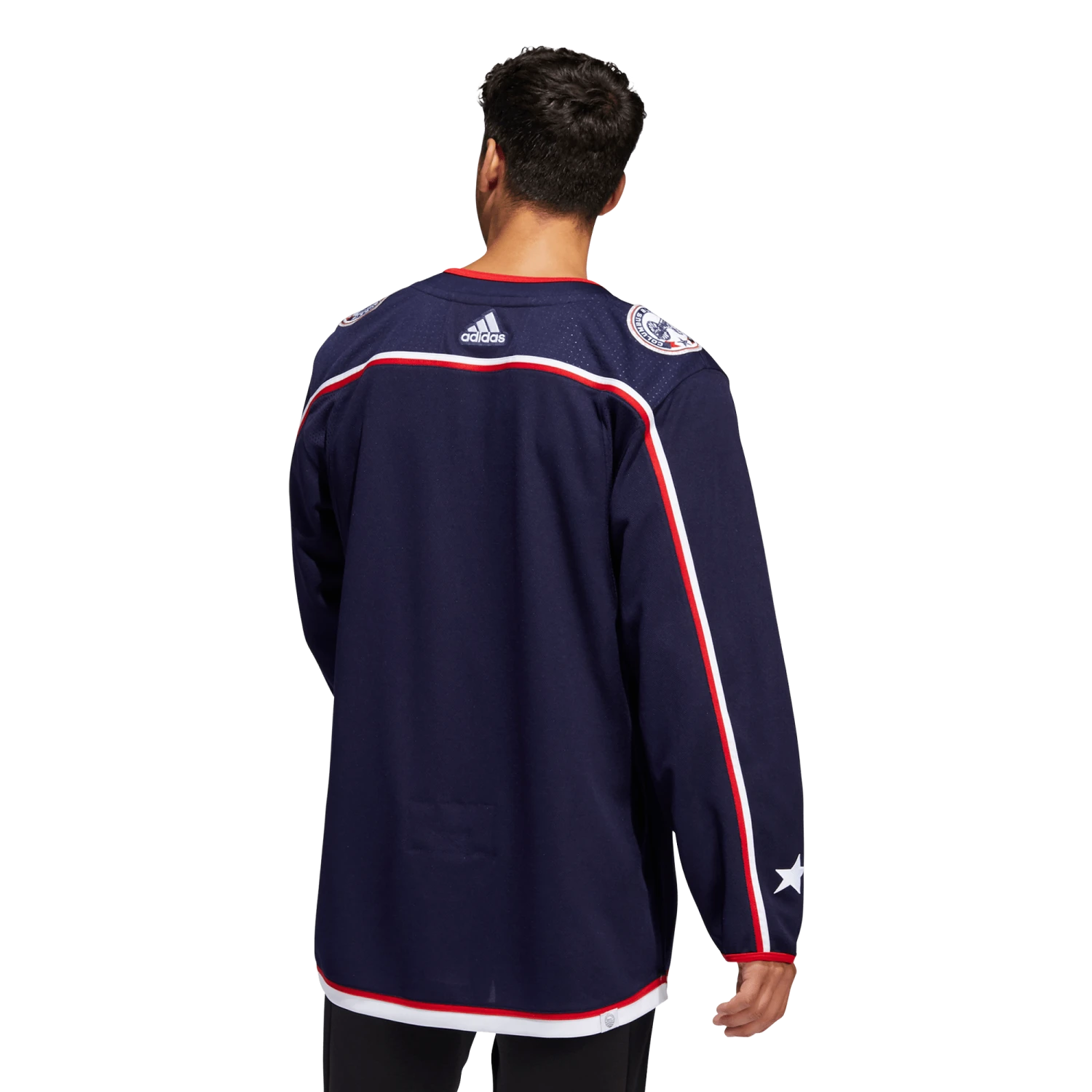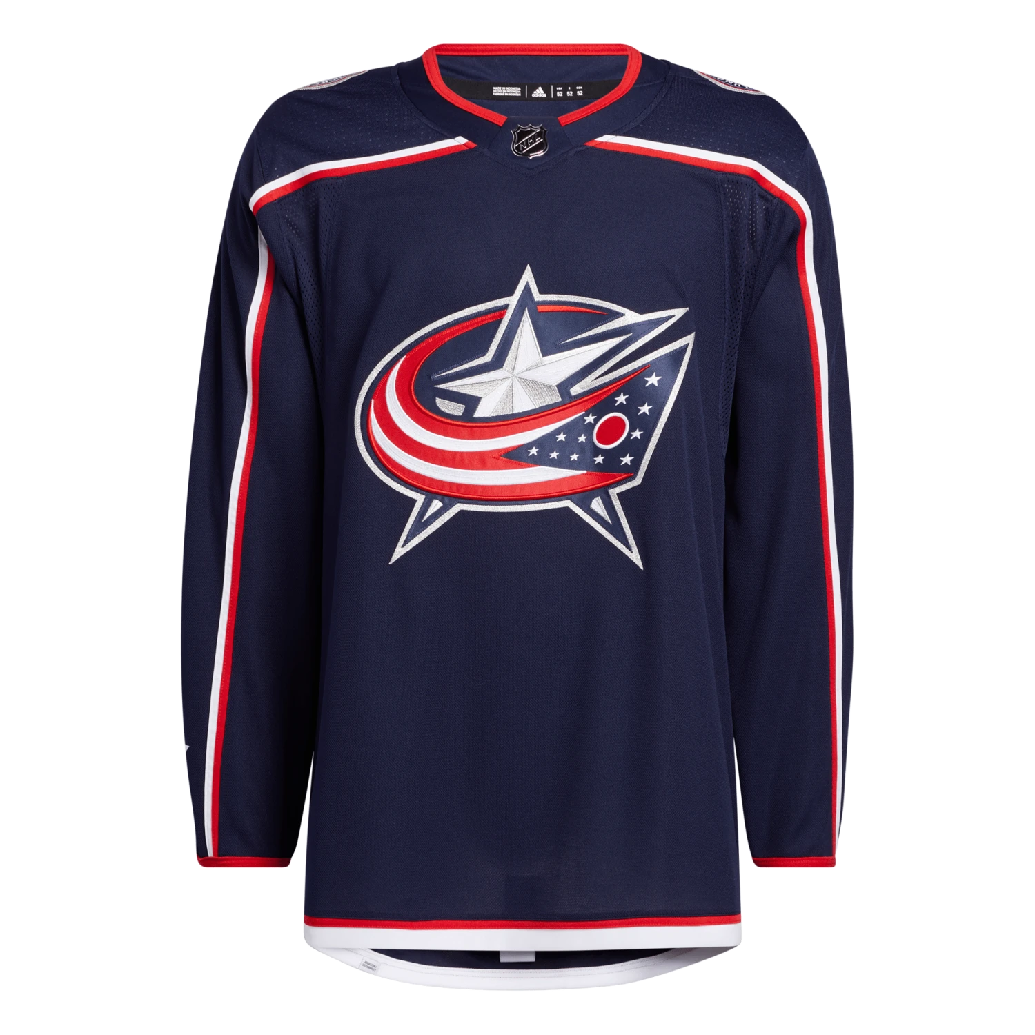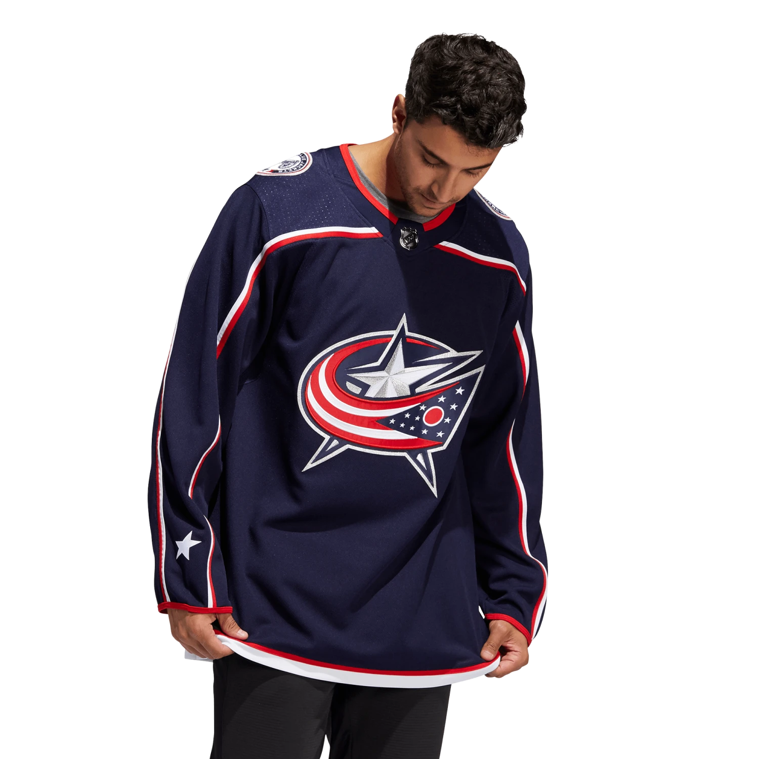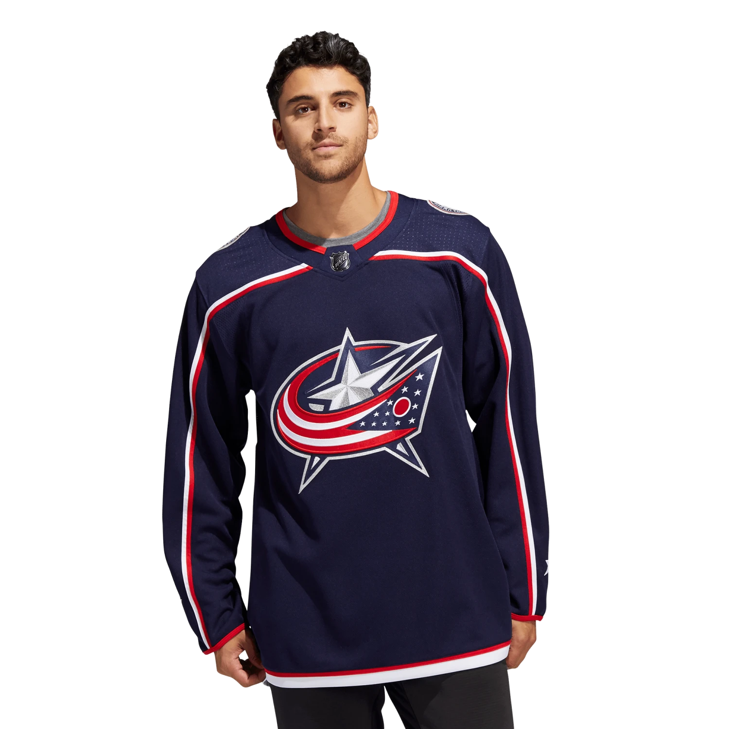 Pull on this adidas Columbus Blue Jackets authentic home jersey, and get the gang together for game night in your fan cave. AEROREADY keeps you cool as you wait for the puck to drop at centre ice. The big crest out front, shoulder patches and fight strap with a snap closure keep the look legit. This product is made with Primegreen, a series of high-performance recycled materials.