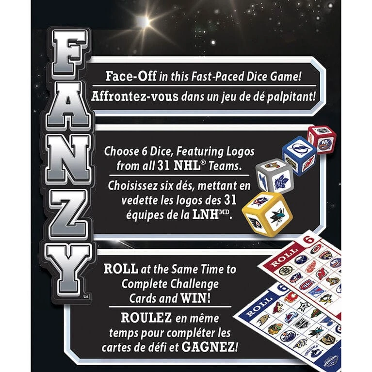 Fanzy is a dice game that’s fun for the whole family. Consisting of 24 dice, 20 challenge cards, four minigames, and all of your favourite NHL teams, this game provides hours of entertainment that your family is sure to love.
