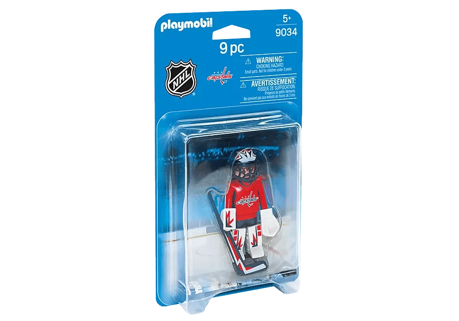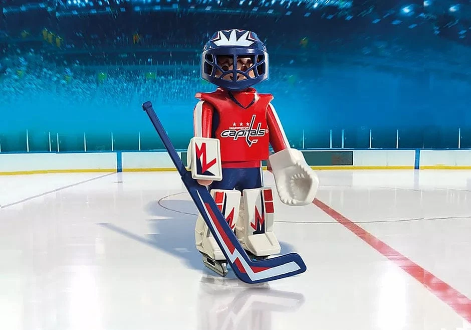 Back the net with the NHL™ Washington Capitals™ Goalie. Set includes 1 Washington goalie, 1 stick, 1 puck, helmet with visor, goalkeeper glove, and 1 arm cuff.