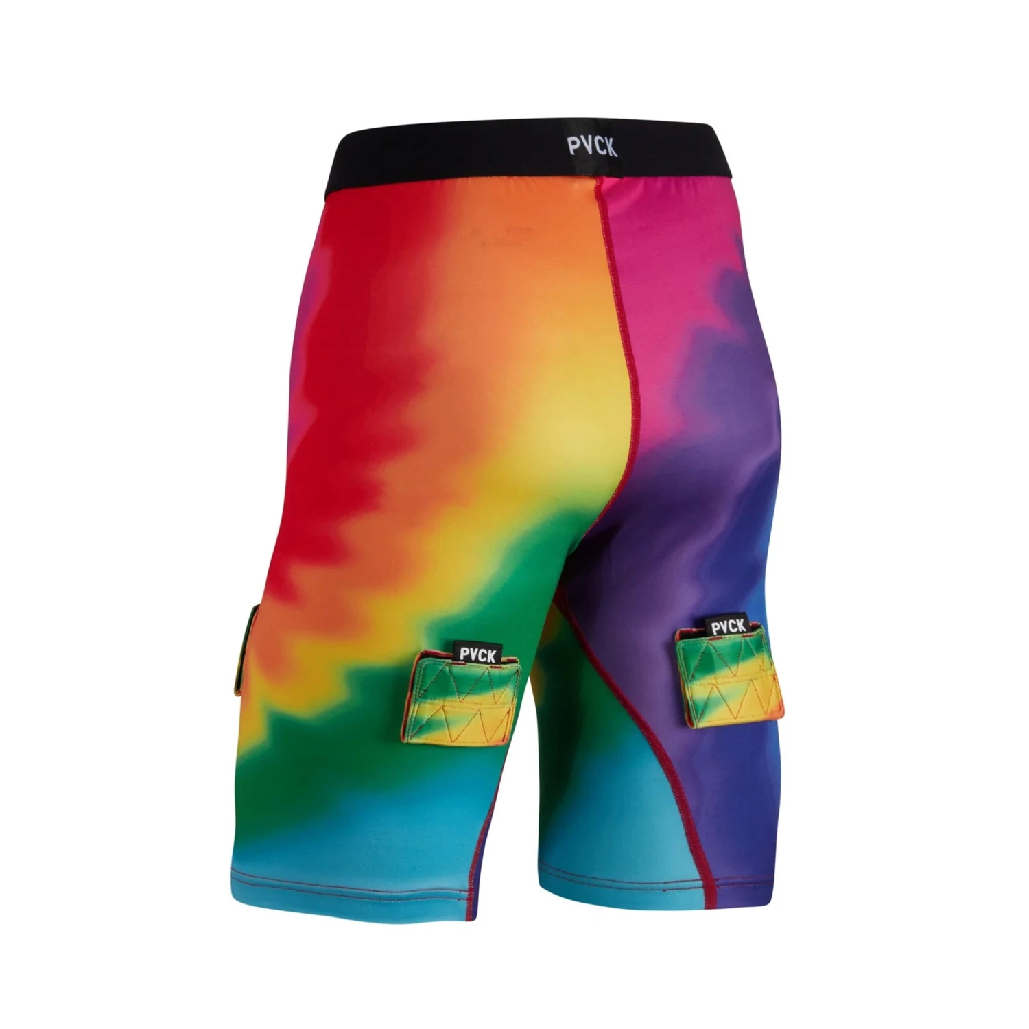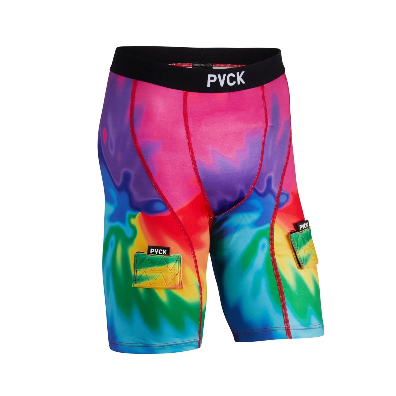 The PVCK Womens Compression Jill Shorts are built for protection, comfort, and style. The bold Tie Dye design is sure to make you stand out in the locker room. Jill and anatomical jill holder secure desired placement of valuables. A soft fitted waistband and antibacterial with moisture wicking materials keep you dry and comfortable. Velcro tabs are placed in the front and back to keep your socks in place during play.Â
