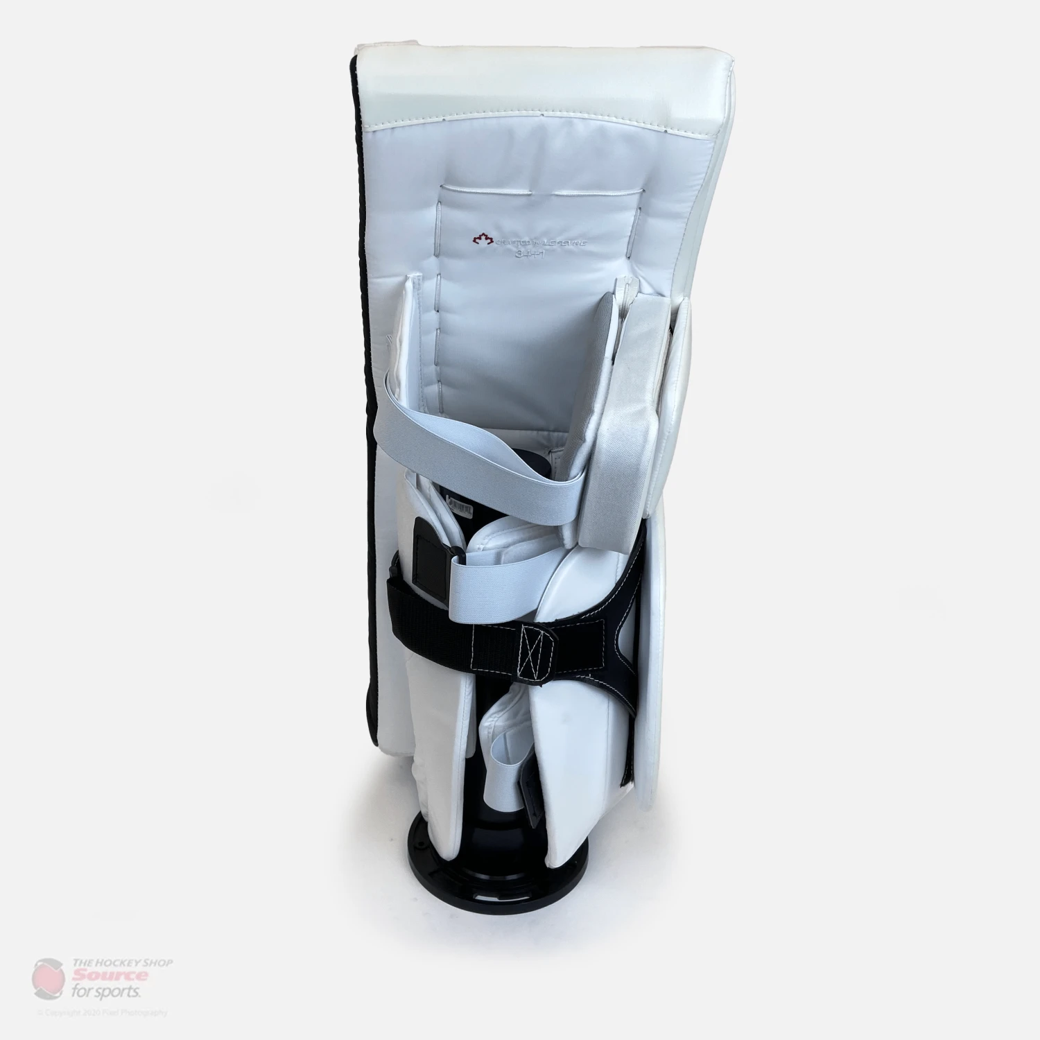 Strapping along the calf is wide, thin, and durable to cover more surface area and lessen the amount of force in a single area while moving, making them more comfortable and last longer. Underneath the calf strappings is a double strapping Fast Rotation System, or FRS. The FRS system fits snug against the leg and is a bit cylindrical, keeping you connected to the pads while allowing for quick and responsive rotation. Being able to respond quickly and efficiently to puck movements is crucial for any goalie, and the FRS system hopes to make decisions on the ice even easier.
