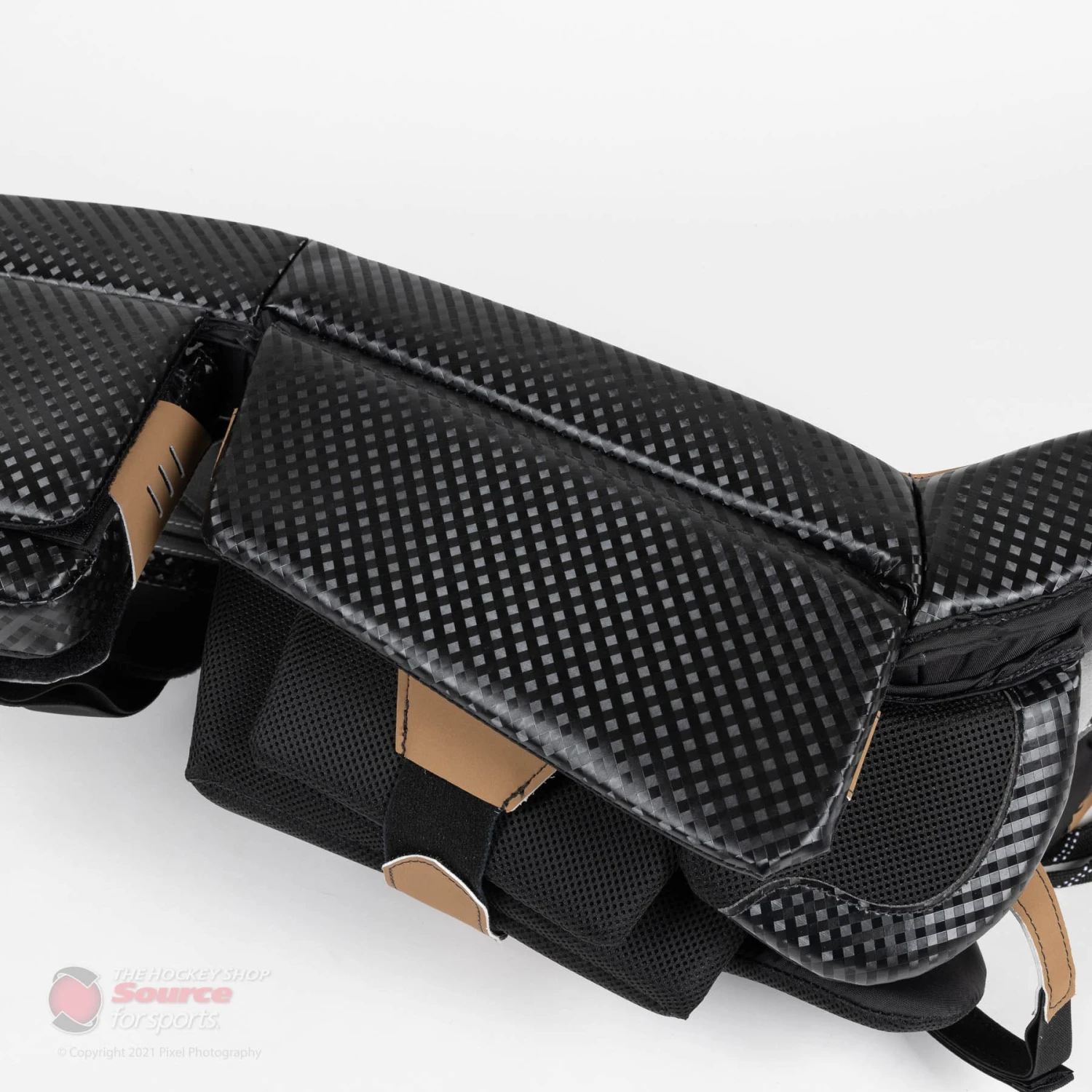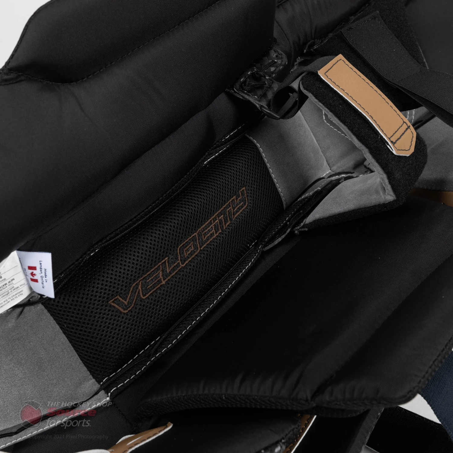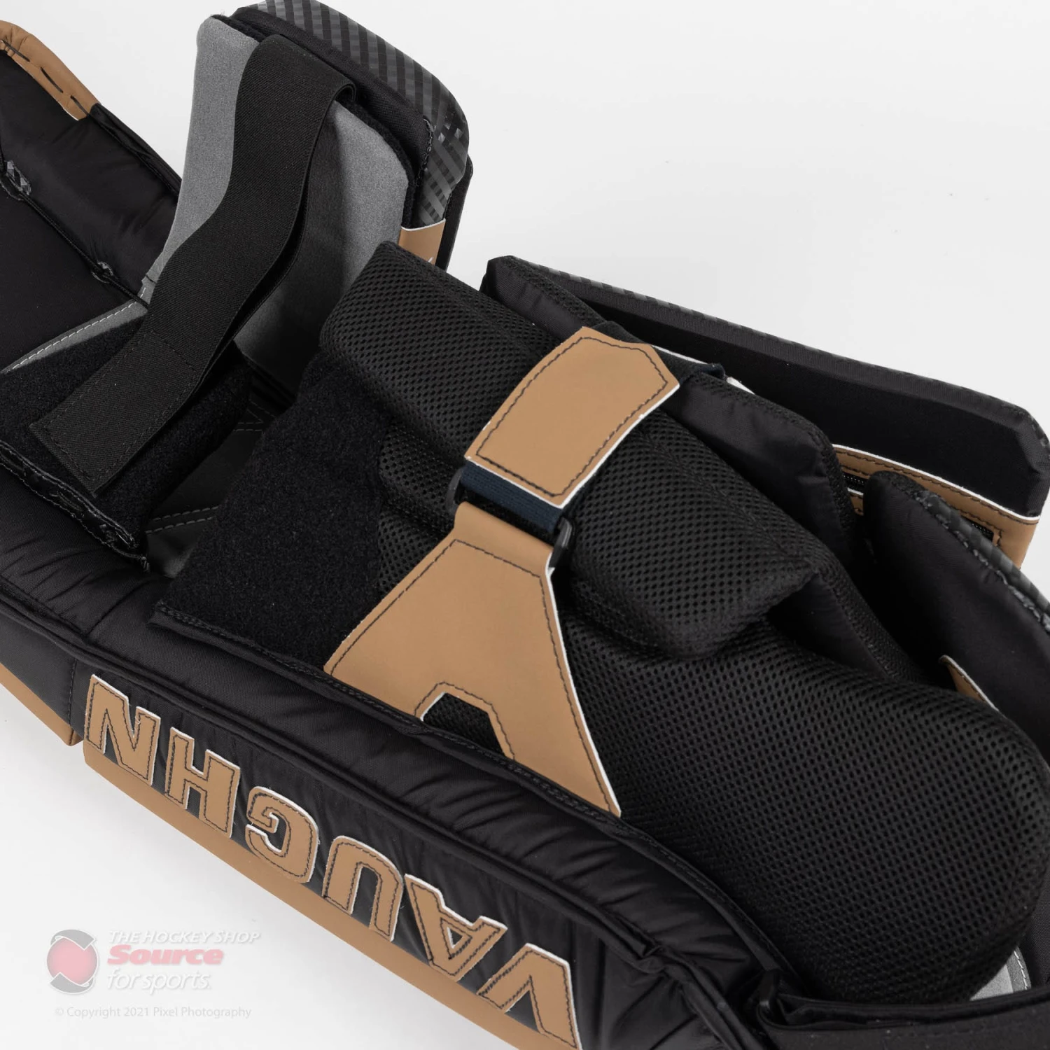 A lower profile, single break outer roll provides good flexibility while further reducing the weight of the V9 Pro Carbon pad. The squared off upper thigh provides better seal and coverage compared to previous Velocity pads and other softer pads. Finally, as the name implies, the V9 Pro Carbon utilizes layers of Vaughn’s new Pure Carbon running tip to toe on top of their sturdy pro core allowing it to maintain its shape while still providing the familiar Vaughn cushion that they have become famous for.