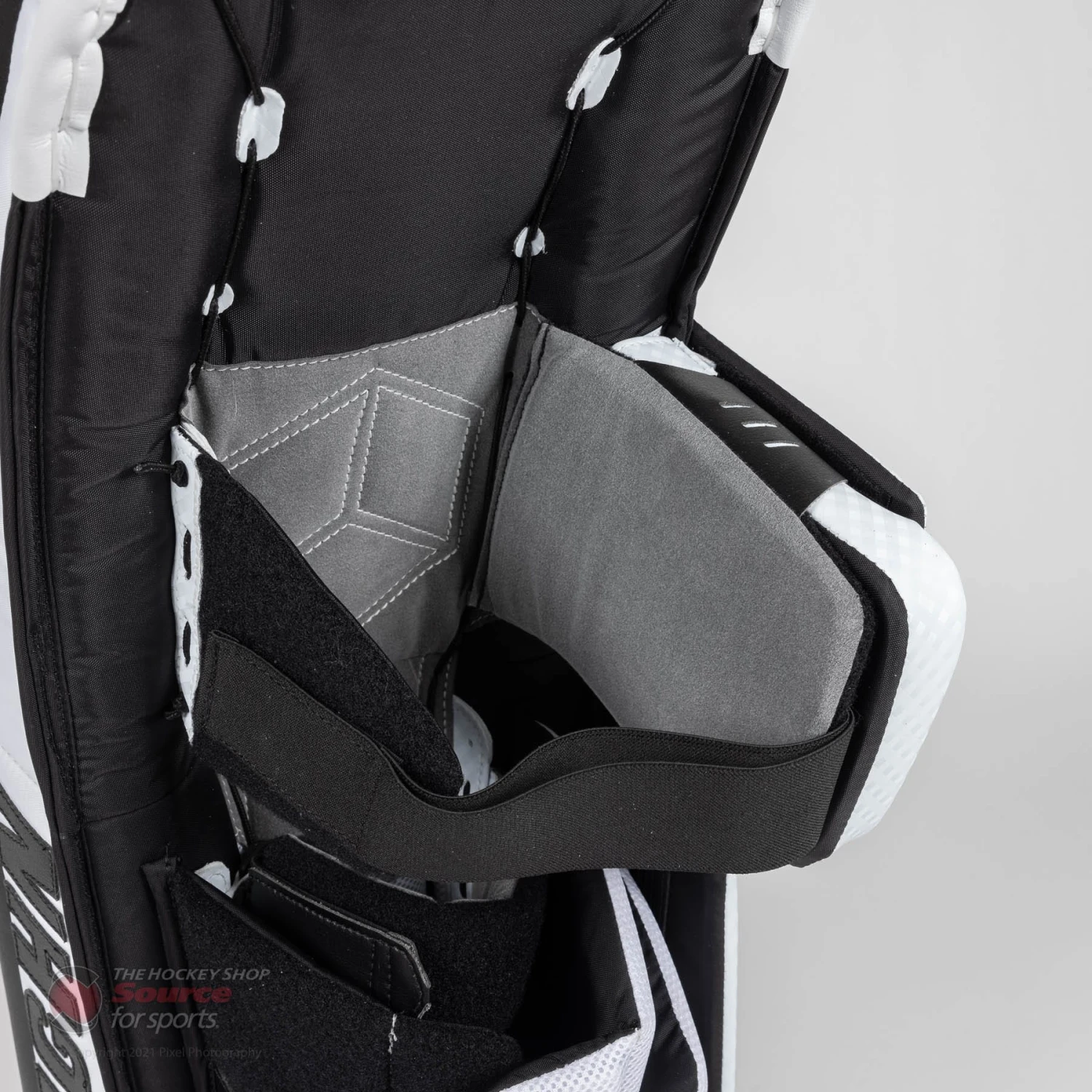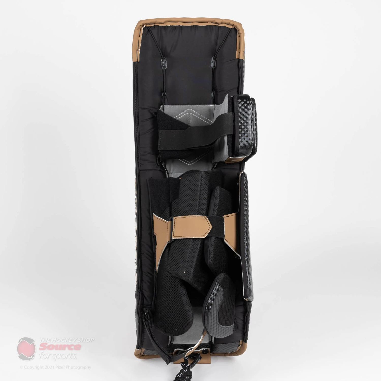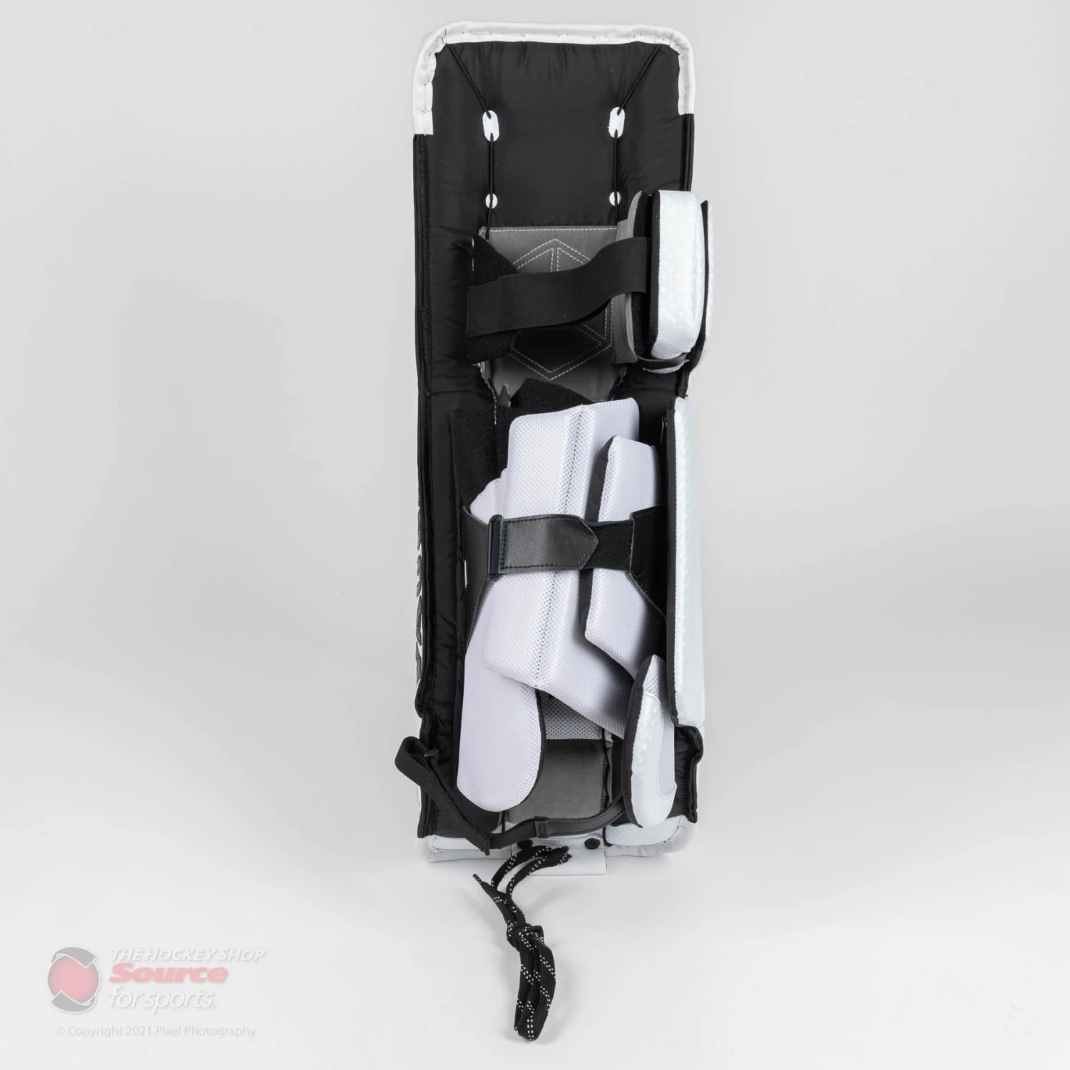 While still a fairly tight fitting leg channel, the V9 Pro Carbon has a widened inner leg cradle overall when compared to previous Velocity pads giving goals the feel of a tight fitting leg channel while offering the better rotation associated with a looser leg channel. Finally, the V9 Pro Carbon features a velcro bootstrap as well as the same bungee toe tie system seen on the SLR2 leg pads.
