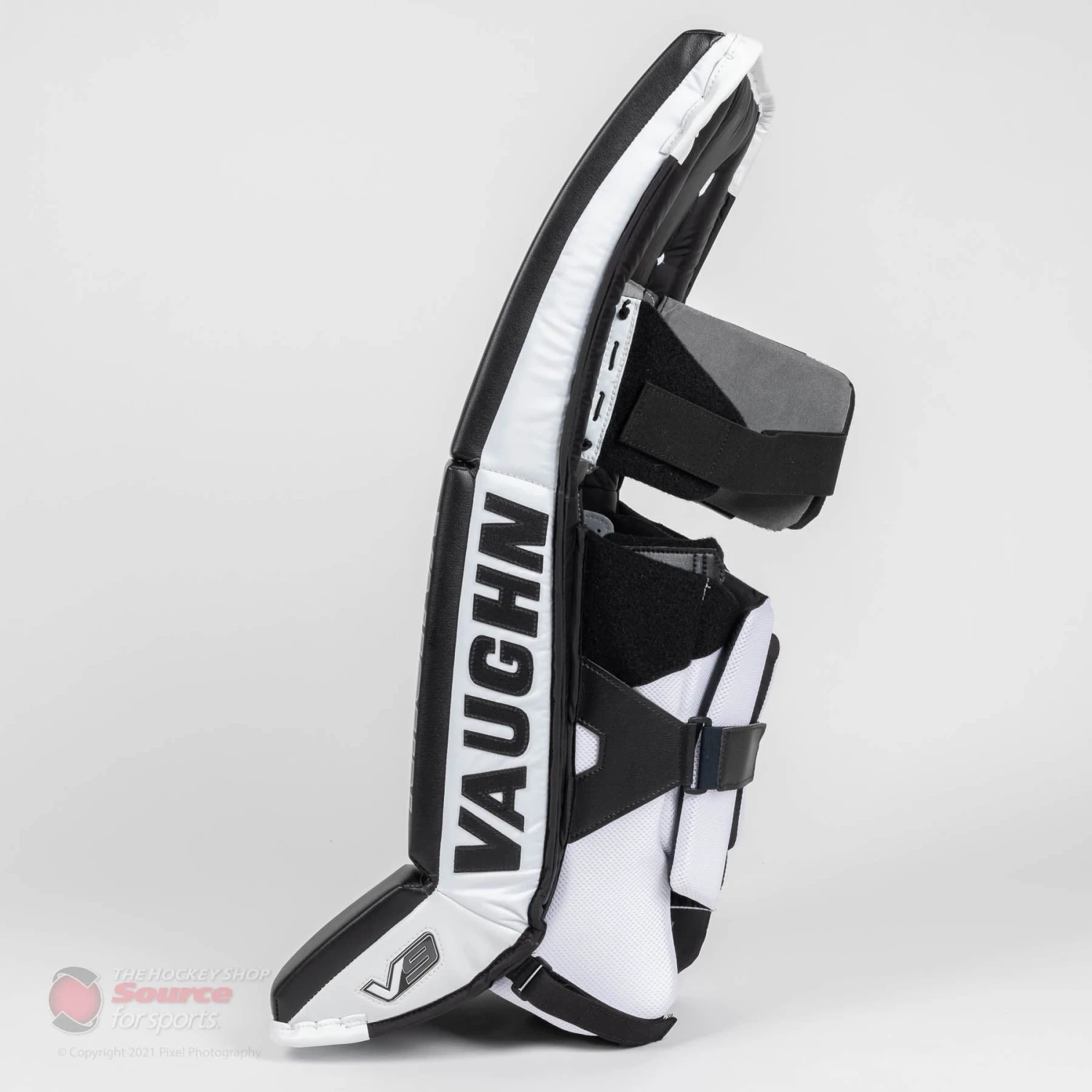 The V9 Pro Carbon features a redesigned strapping system and calf wrap allowing for a simpler, quicker and lighter system. Vaughn uses a velcro Reactive Rotation Control strap that sits on the upper calf to allow for quicker yet more controlled pad rotation while giving the pad a connected feel. The calf wrap uses a single velcro strap to seal its extended wings that offer better coverage over those of the VE8 shut.