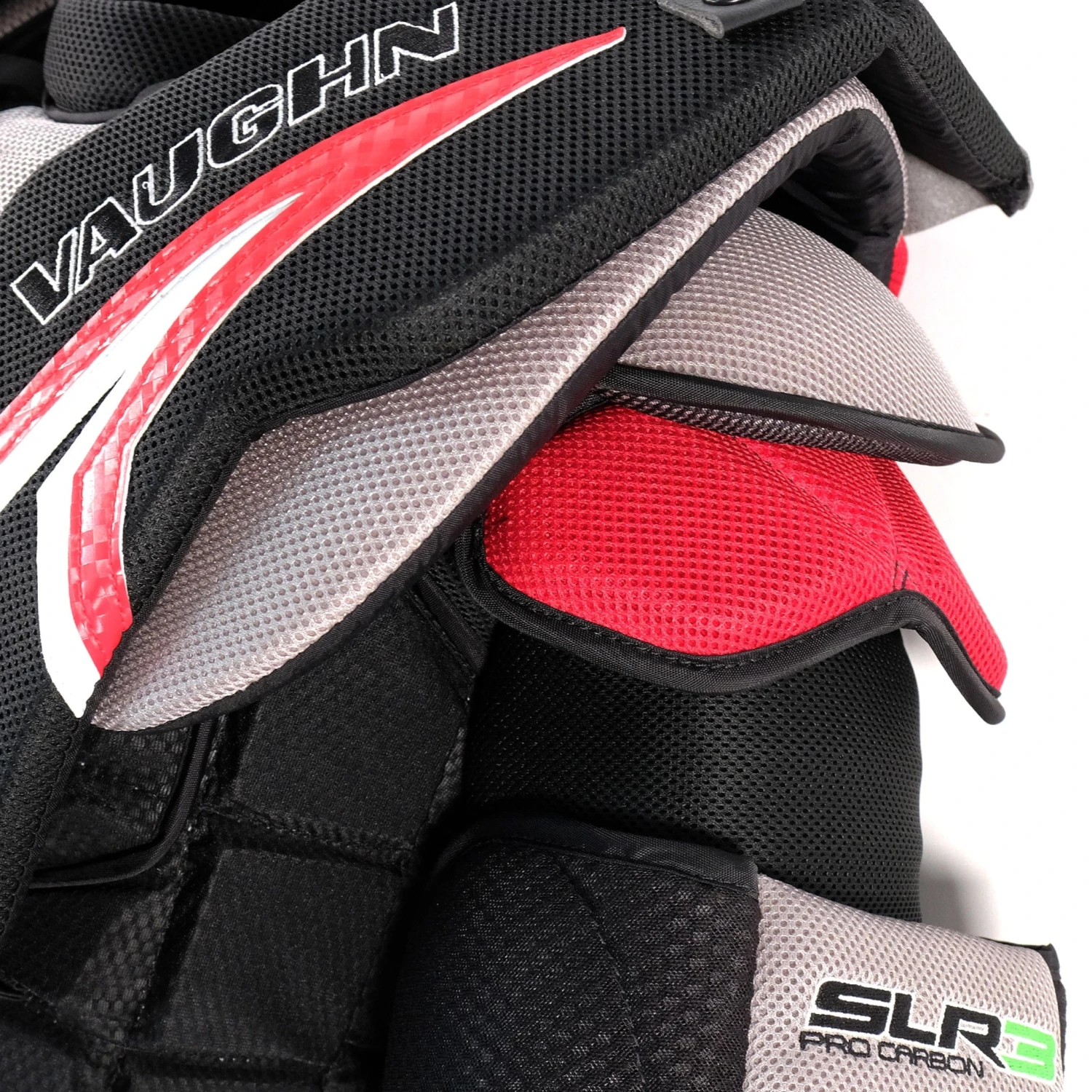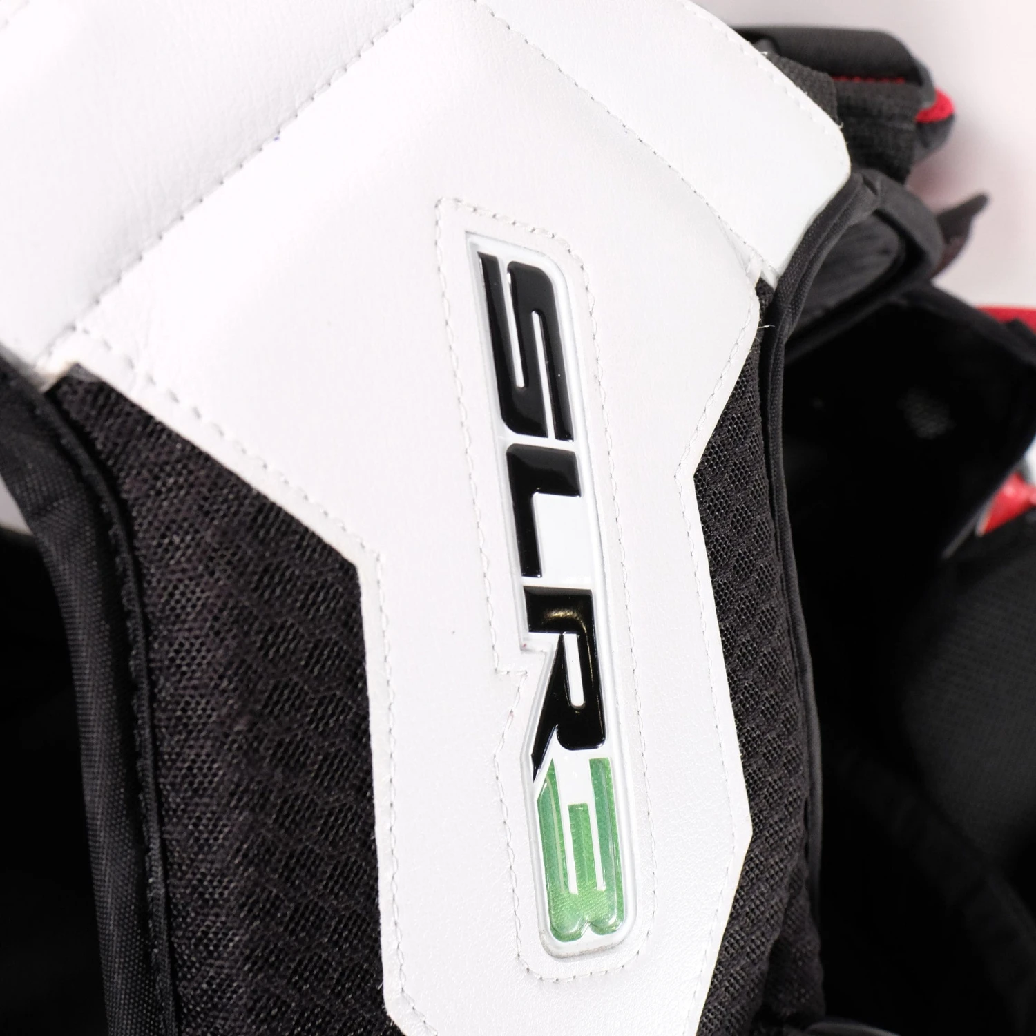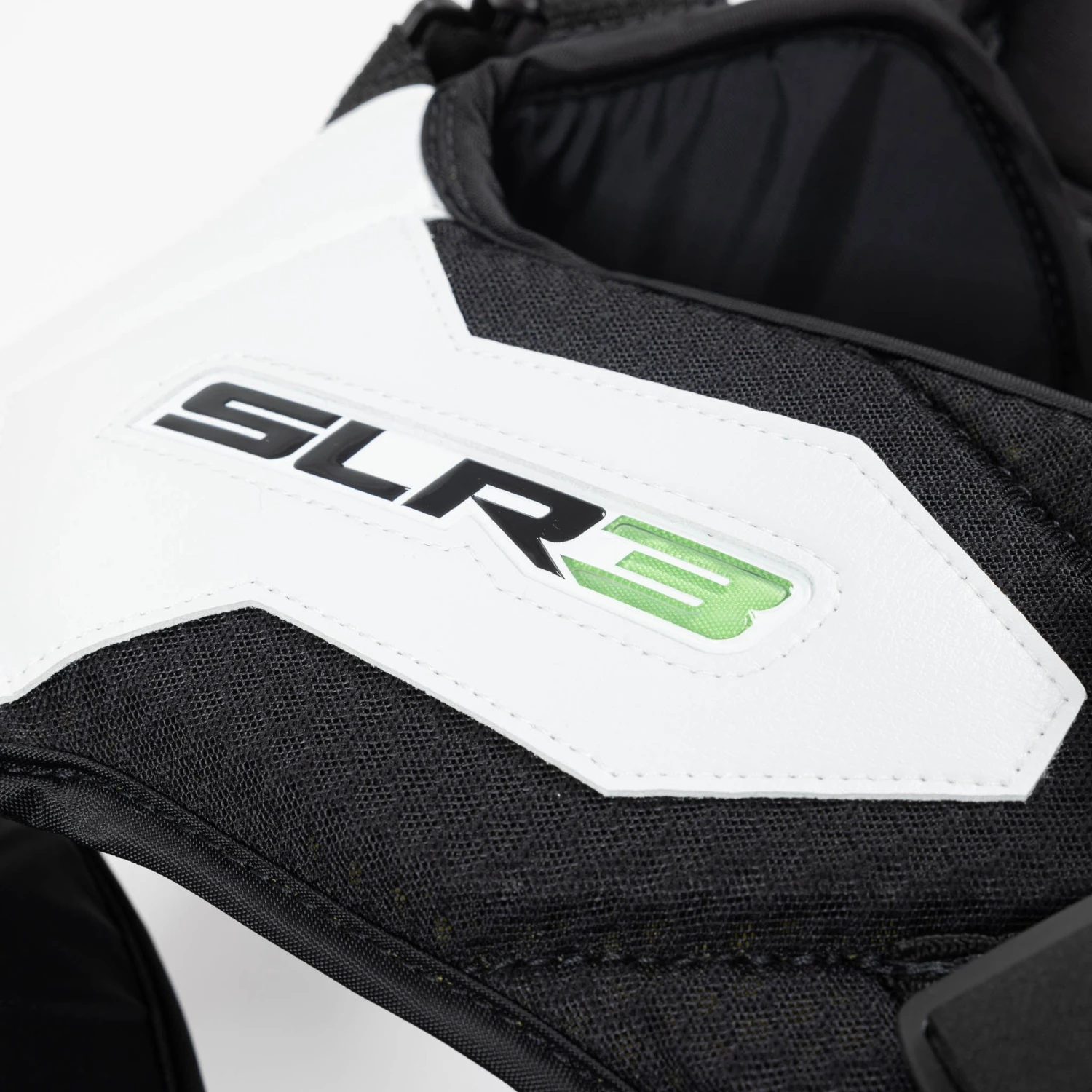The shoulder caps are molded for better fit and are outfitted with a cushion padding to deaden puck momentum on impact. The shoulder pads on the SLR3 have been readjusted in size and positioning to enhance performance, particularly for butterfly-style goalies. The shoulders have been made larger to cover more surface area, and the squared shoulder floaters have been raised for more vertical coverage. Although the pads have been made to stand taller and wider, these characteristics do not hinder mobility.