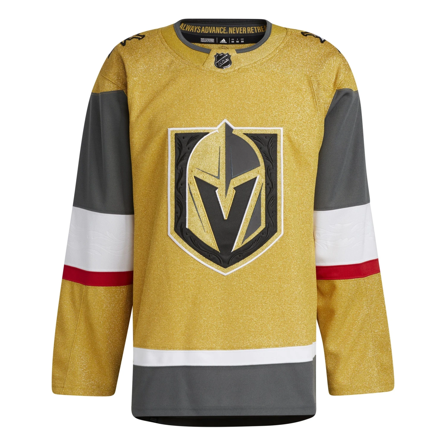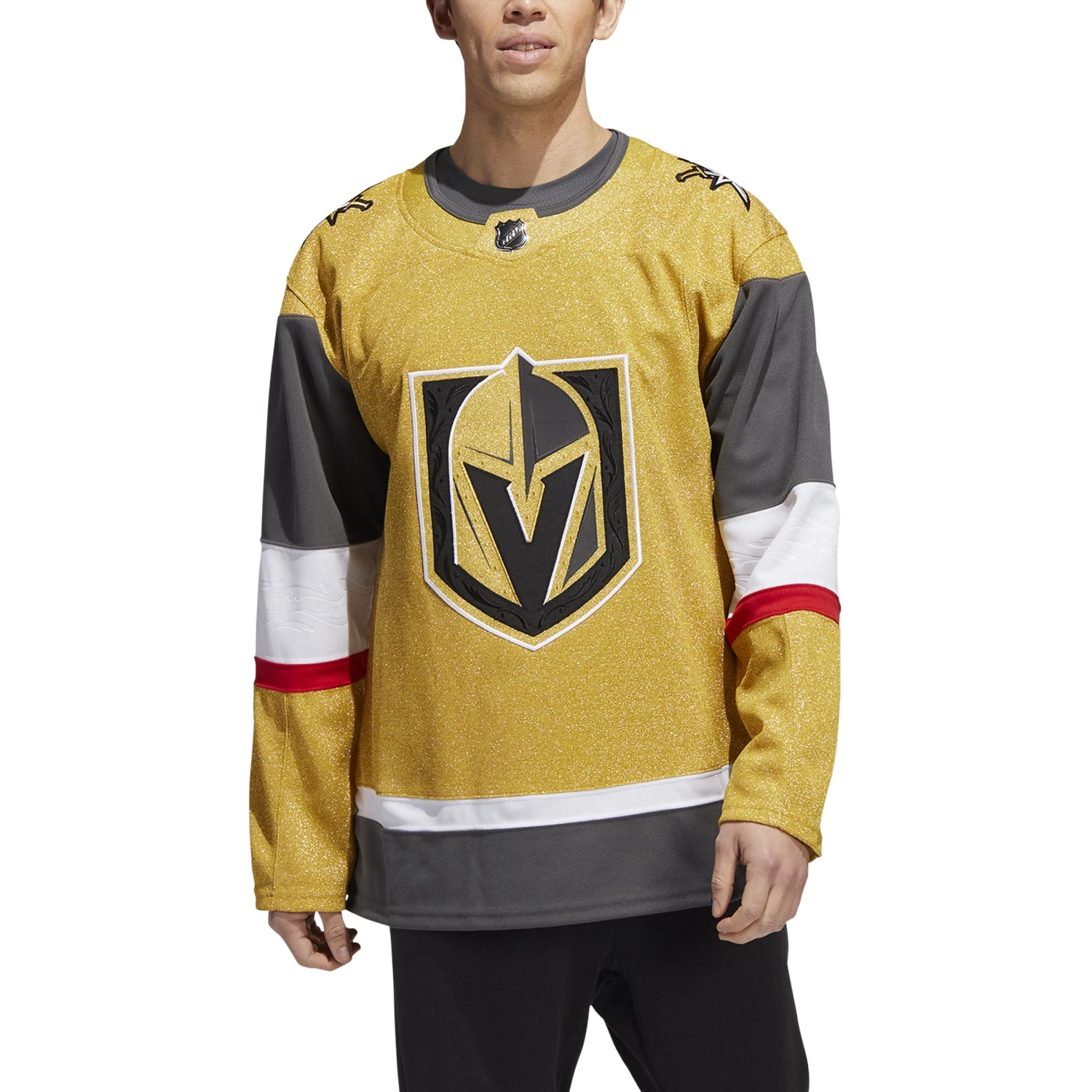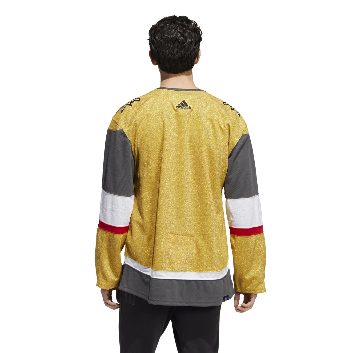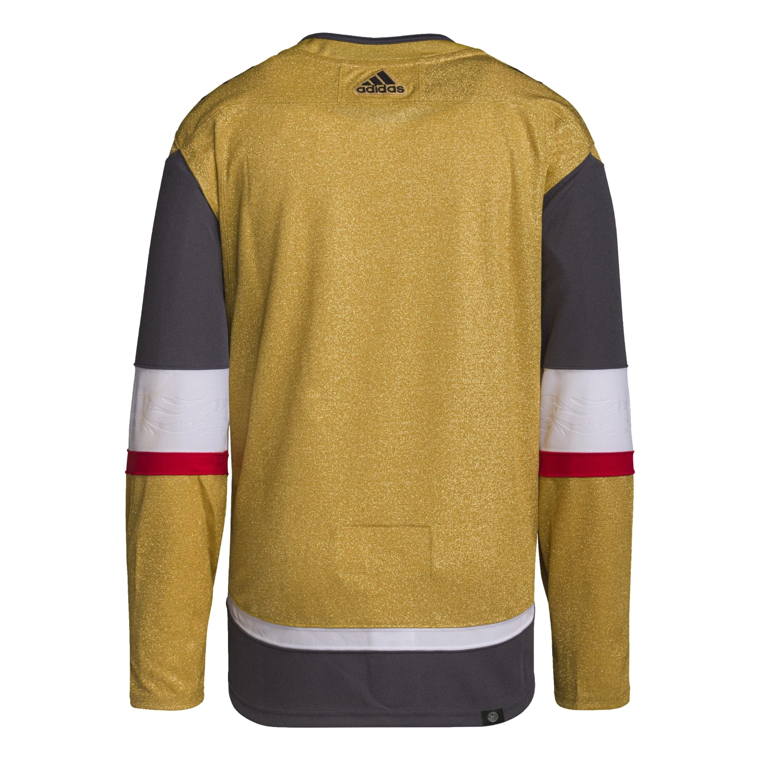 Get all your good luck gear together, pull on this Vegas Golden Knights Alternate Adidas PrimeGreen Senior Jersey and cheer on your favorite team. AEROREADY keeps you cool as the Knights’ descend on the net. A mesh underarm insert adds breathability as you jump to your feet when the goal horn sounds. This product is made with Primegreen, a series of high-performance recycled materials.